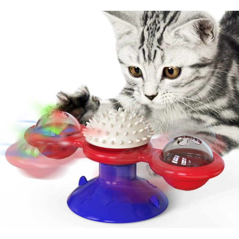 Cat Entertainment Set- Interactive Rotating Disk, Feather Teasers, Tumbler, Windmill Toy - Keeps Cats Active & Engaged