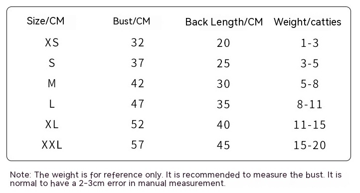 Size: XS (recommend weight 0.50 kilograms-1.50 kilograms, S (recommend weight 1.50 kilograms-2.50 kilograms, M (recommend weight 2.50 kilograms-4.00 kilograms, L (recommend weight 4.00kg-5.50kg, XL (recommend weight 5.50kg-7.50kg