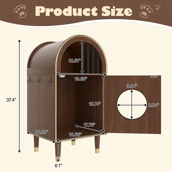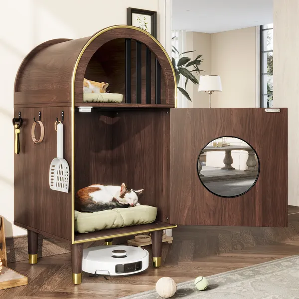 Modern Arch Design: Features a stylish arched silhouette with natural wood grain, perfectly blending with modern, minimalist interiors. Adds elegance to your home while providing a playful space for your cats. 2-Tier Cozy Retreat for Cats: The two-tiered structure provides cats with more options: an upper, ventilated resting area and a lower, quiet sleeping pod, allowing cats to freely switch between playing and resting, enjoying a greater sense of security and comfort. Easy Access: A large front door combined with the built-in round passage opening allows smooth movement between levels, making entry and vertical play effortless. The circular window adds natural light, creating a brighter and more comfortable resting environment. Convenient Side Hooks: Built-in side hooks keep essentials like litter scoops, toys, or leashes neatly organized and within reach. Raised Legs Compatible with Robot Vacuums: Raised legs allow robot vacuums to pass underneath, making cleaning effortless and keeping your home tidy. Durable and Long-Lasting Material: Constructed with high-quality materials, this indoor cat house is built to last. The solid eucalyptus wood legs paired with non-slip metal foot covers provide enhanced stability and safety, creating a warm, secure, and enjoyable environment for your pet. Net Weight:29.87LBS Weight Capacity:44LBS Material:MDF Assembly Time:30 minutes