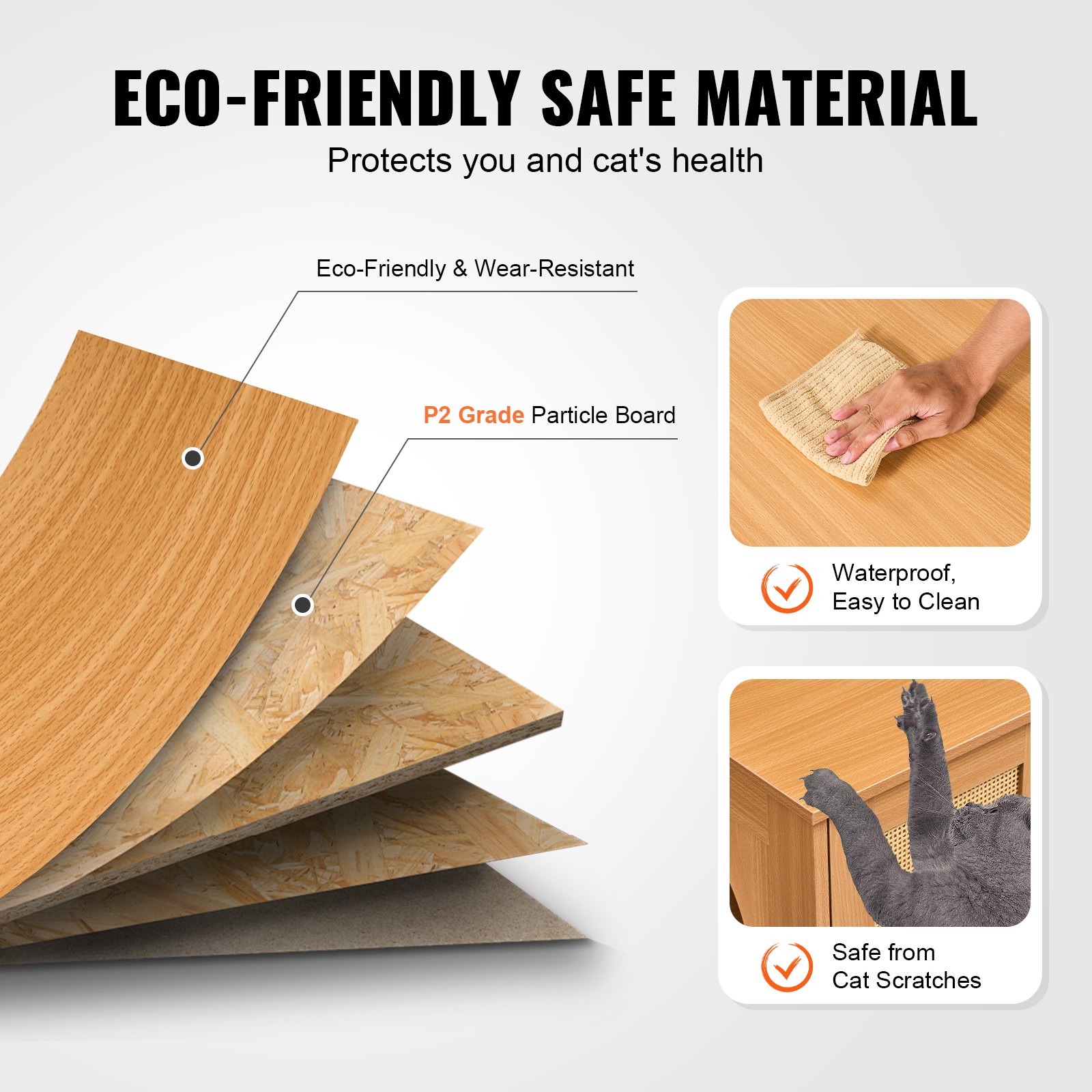 Features & Details Hidden Aesthetic Design: The modern cabinet with rattan doors not only provides private space for your pet but also makes your room look neater. The wooden cat litter box enclosure can hide the cat litter box, perfectly matching the home decoration. Adopting a high-quality aluminum alloy handle, with a magnetic suction door, the opening is easy and smooth. Spacious Space: Measuring 47.2x19.7x21.7in, this cat litter box furniture provides a comfortable and free resting space for pets. It can accommodate cat litter boxes with a length of less than 21" and a width of less than 17.7". It is equipped with 4 doors and 2 windows for cats' easy access freely. Heavy-duty Loading: The top loading is up to 150lb/68kg, with a firm and stable structure, for safely placing vases, books or other decorations. The cat litter cabinet can also be used as a cat house, tea table, coffee table or TV cabinet. The bottom adds support feet to enhance stability and loading capacity up to 100lb/45kg, which can be placed on cat litter boxes or other heavy objects. Premium Materials: The P2 grade particle board ensures the health and safety of pets and your whole family. The high-quality finish surface with smooth edges is waterproof, easy to clean and maintain, wear-resistant and damage-resistant, and not afraid of cat scratching. The board is pre-drilled and numbered for your convenience. Versatile Use: In addition to being a cat litter furniture hidden, it can be a rest area for cats, as well as additional storage space. Suitable for living rooms, bedrooms or bathrooms and is easily integrated into the home environment without taking up extra space.