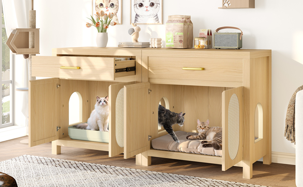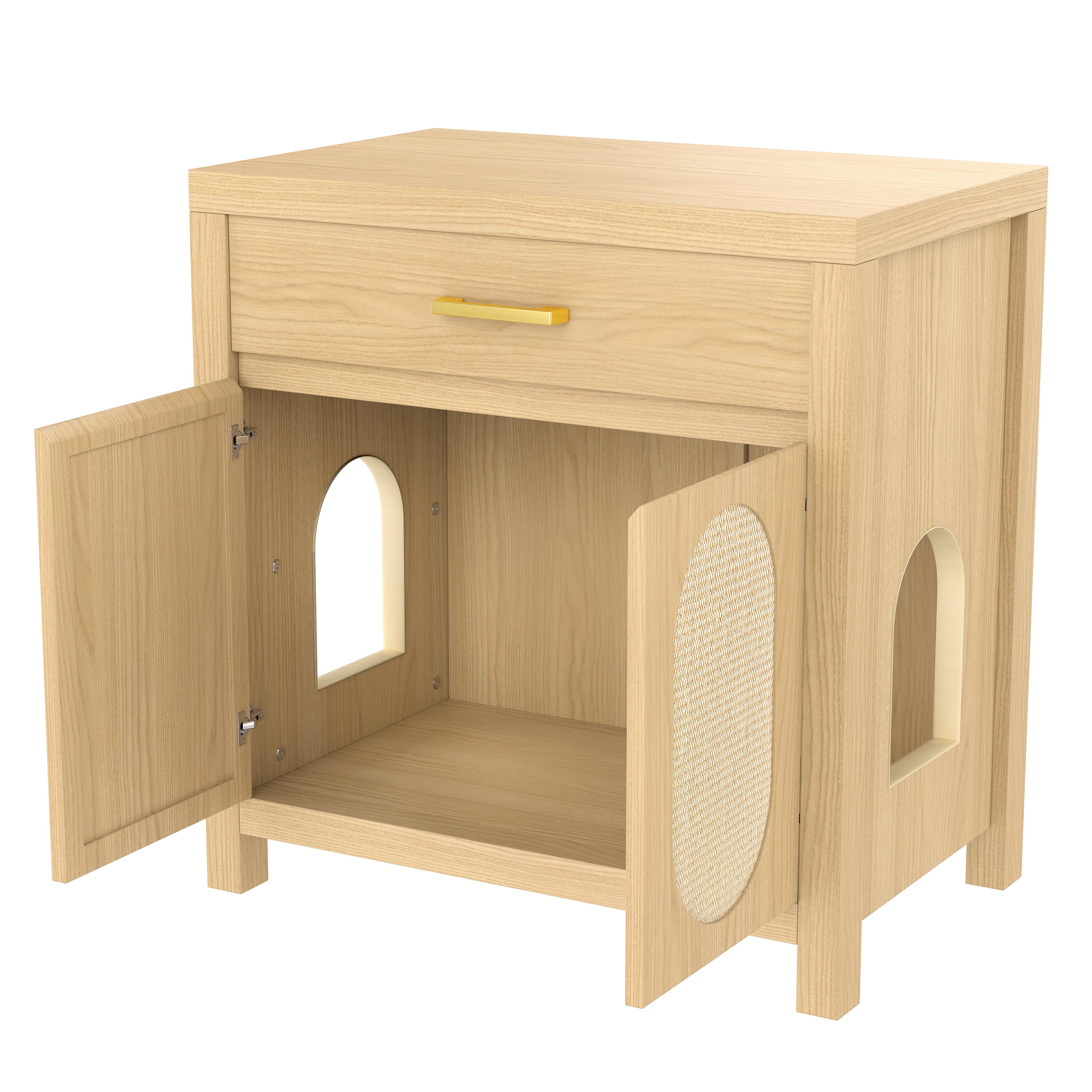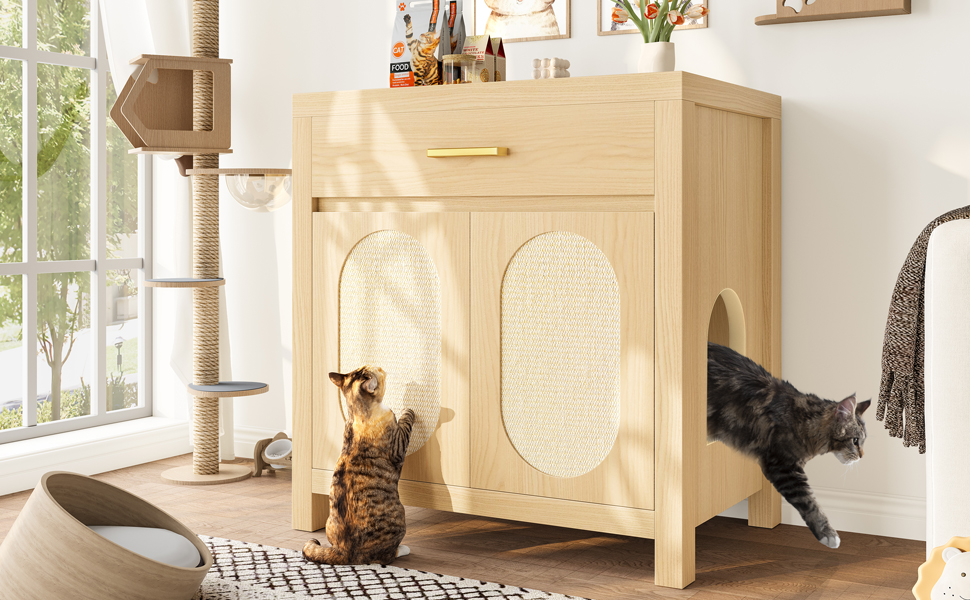 Product Name:Cat Litter Box Enclosure, Hidden Cat Litter Box Furniture with Scratching Board Doors and Storage Drawer, Wooden Washroom Cat House Table Nightstand Box Cabinet, Natural