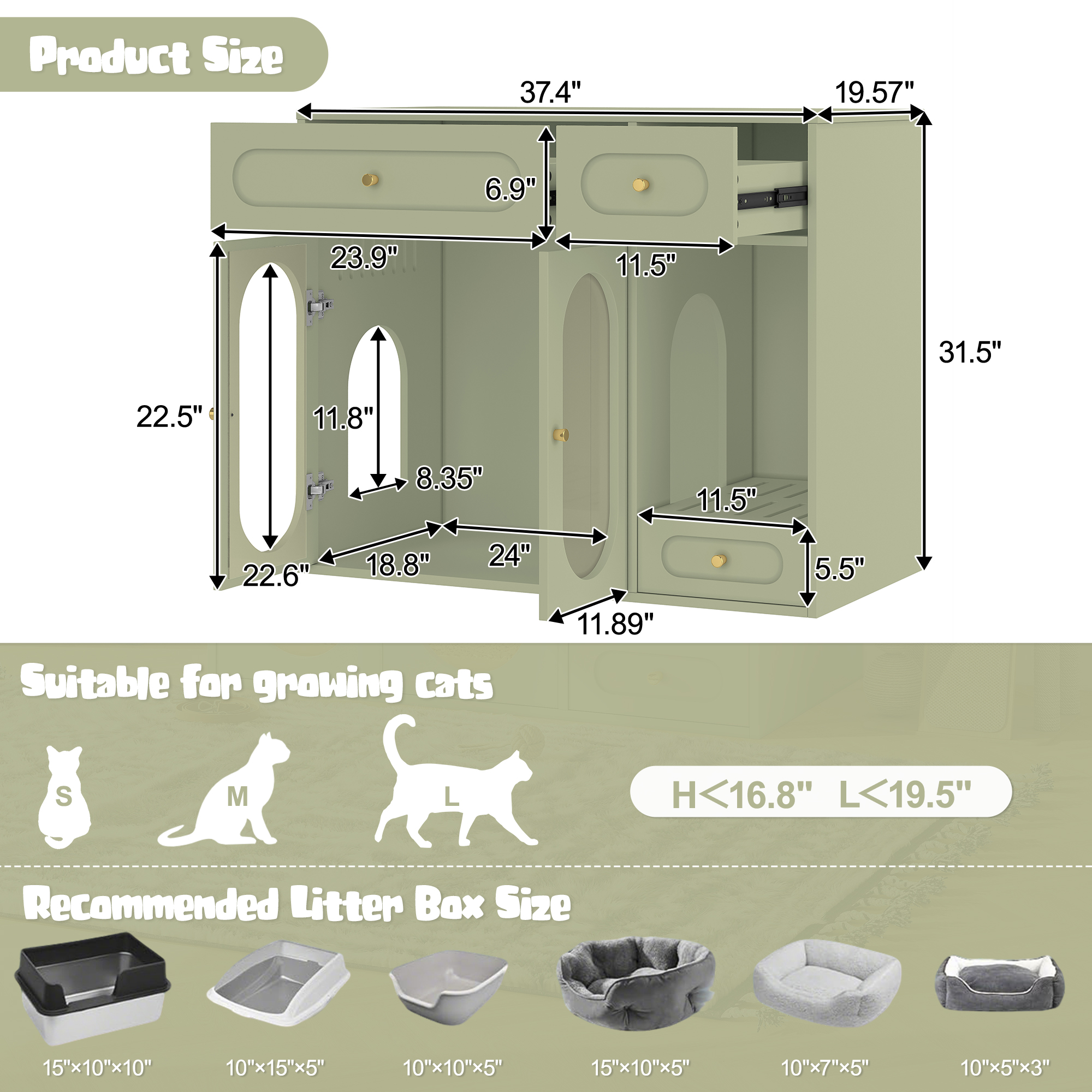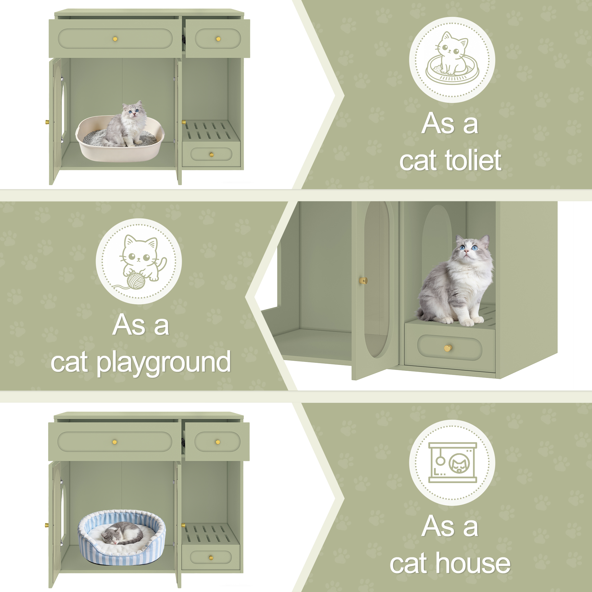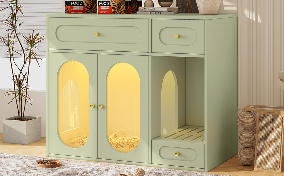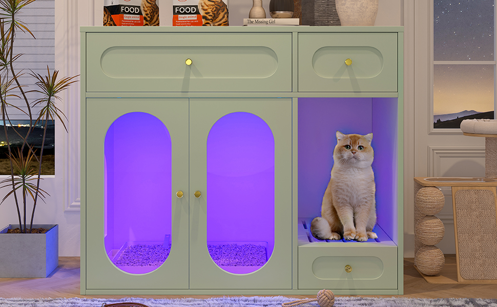 Product Name:Cat Litter Box Enclosure with LED Light, Hidden Litter Box Furniture with Storage Drawers,Fit Most of Litter Box, Indoor Pet House with Acrylic Doors, End Table for Living Room, Green