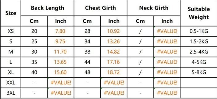 Size: XS back length 20cm (recommended 1-2 kg), S back length 25cm (recommended 3-4 kg), M back length 30cm (recommended 5-7 kg), L back length 35cm (recommended 8-10 kg), XL back length 40cm (recommended 11-15 kg)