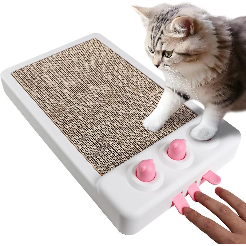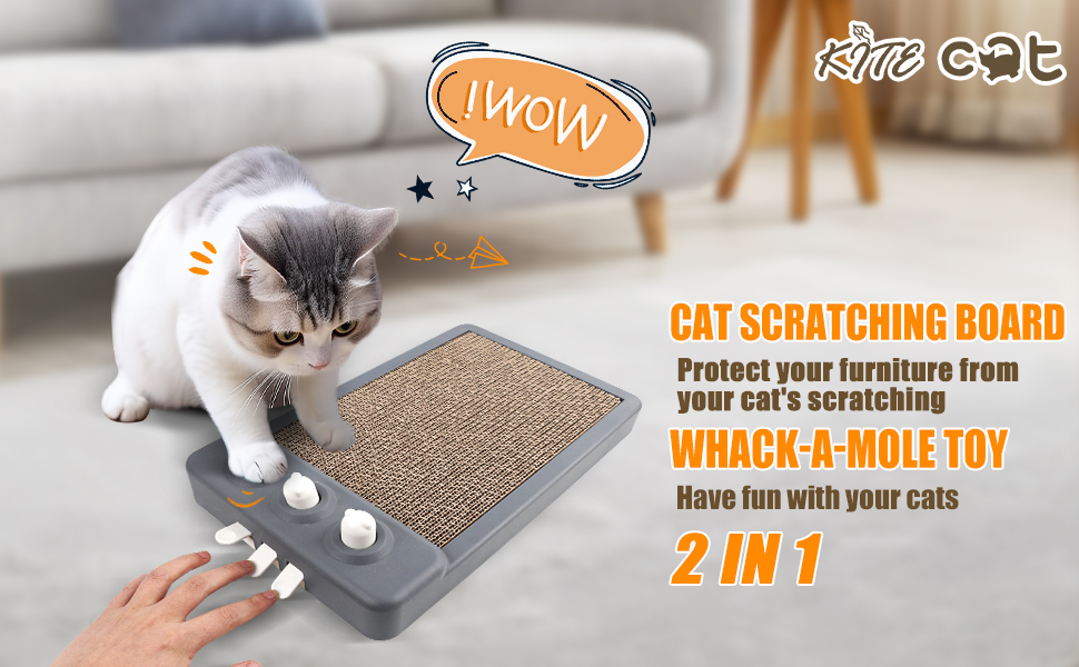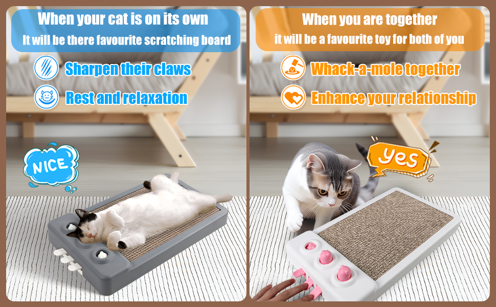 [FUNNY CAT TOY]: Our cat scratching board is so much more than just a scratching board! It's also a fun cat toy! Why not come and play with your cat in your spare time? A happy game of whack-a-mole can be a great way to burn off your cat's high energy and at the same time make you closer to each other!