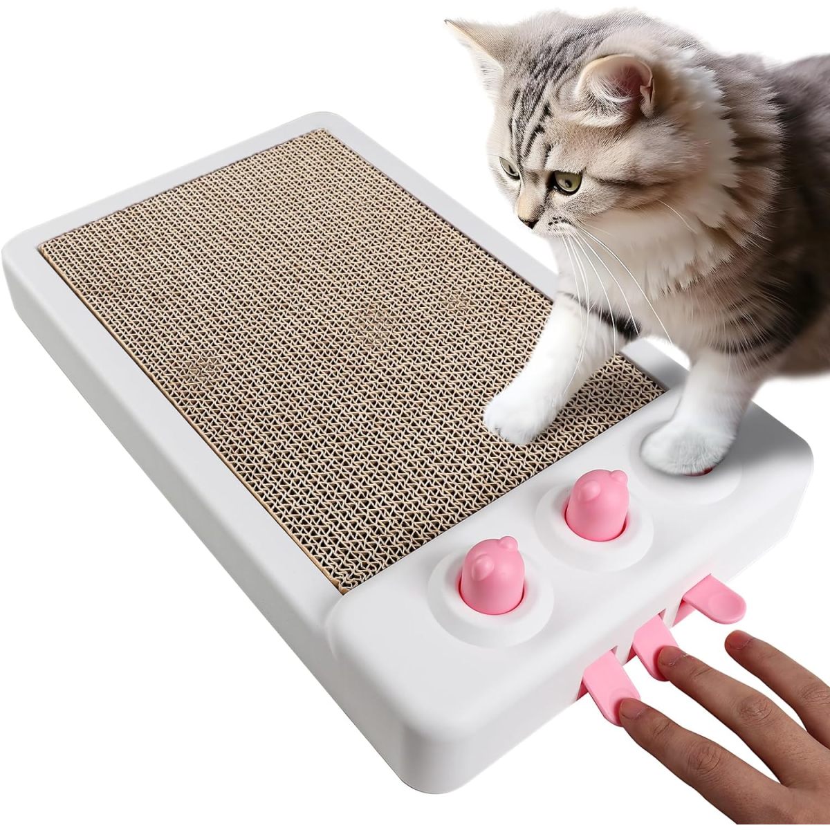 [2-IN-1 CAT SCRATCHING BOARD]: What happens when a cat scratching board and a cat gopher toy are fused together? The answer is double the fun! Simply press the button of the whack-a-mole while your cat is sharpening their claws, and they'll be easily attracted to the attention! At the same time, your cat will be more addicted to our cat scratching board because of playing whack-a-mole with you so often, thus protecting your furniture better.