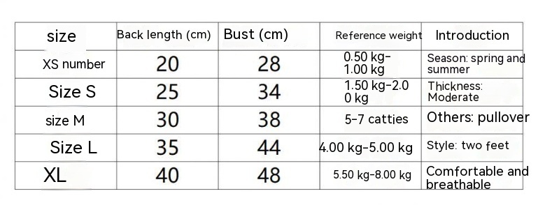 Size: XS back length 20cm (recommended 0.50kg-1.00kg,XL back length 40cm (recommended 5.50kg-8.50kg,S back length 25cm (recommended 1.50kg-2.00kg,L back length 35cm (recommended 4.00kg-5.00kg, M back length 30cm (recommended 2.50kg-3.50kg