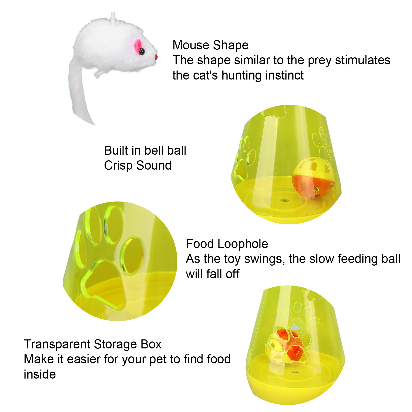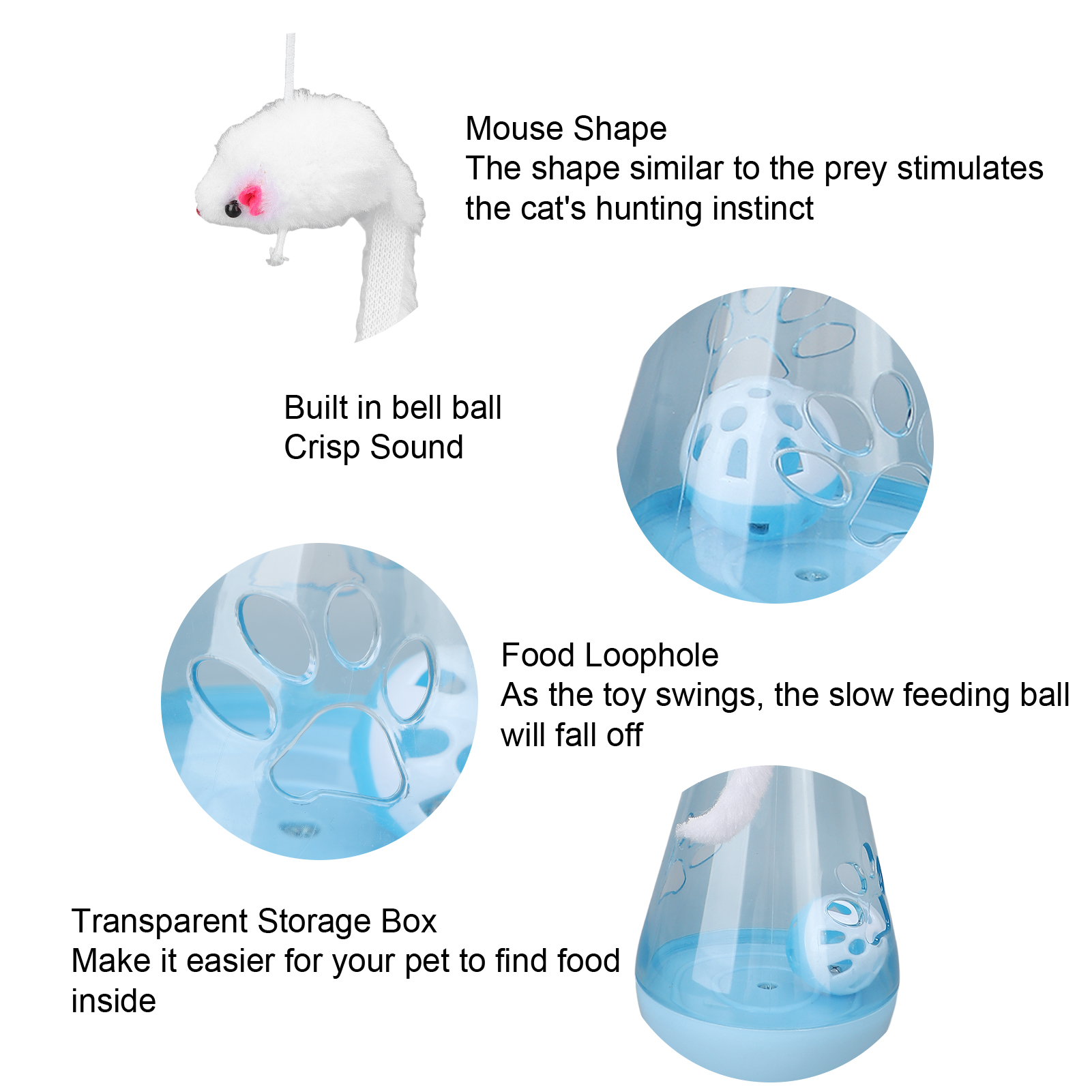 4、FOOD LOOPHOLE: As the toy swings, the slow feeding ball will fall off. The transparent storage box makes it easier for your pet to find food inside.