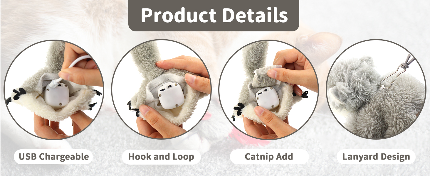 USB Charging: This cat toy can be charged via USB, saving the time and expense of replacing batteries. The charging unit is removable for easy cleaning of the plush toy. The toy stays quiet when left alone to conserve battery power.