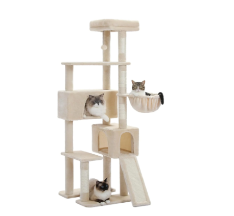 1. Multi-area and multi-functional: It includes hammocks, baskets, cat beds, a distant viewing platform + wooden stakes, hanging balls, and ladders. With a 5-layer design and 3 top platforms, it meets the climbing, playing, and resting needs of multi-cat families