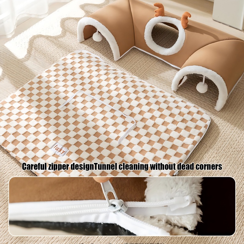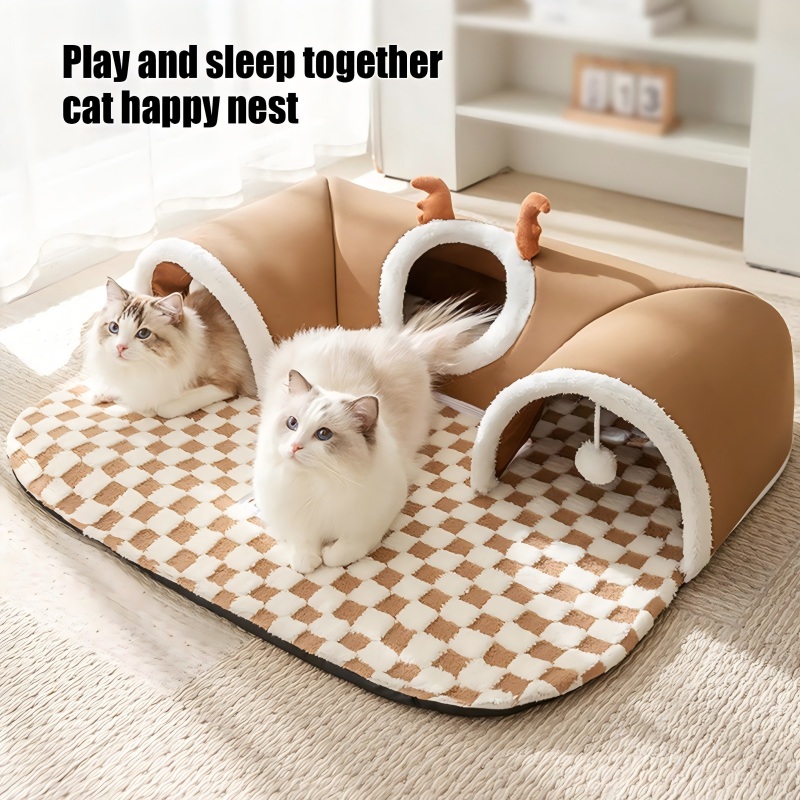 Enlarged Cat Tunnel:The spacious door opening allows cats to enter and exit freely, while the curved tunnel allows them to play peekaboo. The cute cat bed comes with two hanging balls, adding fun to hide-and-seek games. Let cats unleash their natural instincts and relieve stress. It's a good gift for your cat.