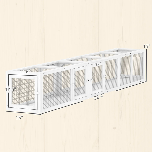 Features: - Flexible design allows various shapes for endless fun - Easily combines with windows, houses, or cages for versatility - Features eight doors for entry, enhancing exploration - Removable door knobs adapt to your cat's play preference - Robust construction and material ensure long-term use - Suitable for cats under 10 lbs. for safe play - Assembly required Specification: - Color: White - Material: Fir wood and metal wire - Overall dimensions: 98.4" L x 15" W x 15" H - Long section: 59.1" L x 15" W x 15" H - Short section: 39.4" L x 15" W x 15" H - Inside: 57.5" /37.8" L x 13.4" W x 13.4" H (Long/short) - Door: 12.6" W x 12.6" H - Weight capacity: 10 lbs.