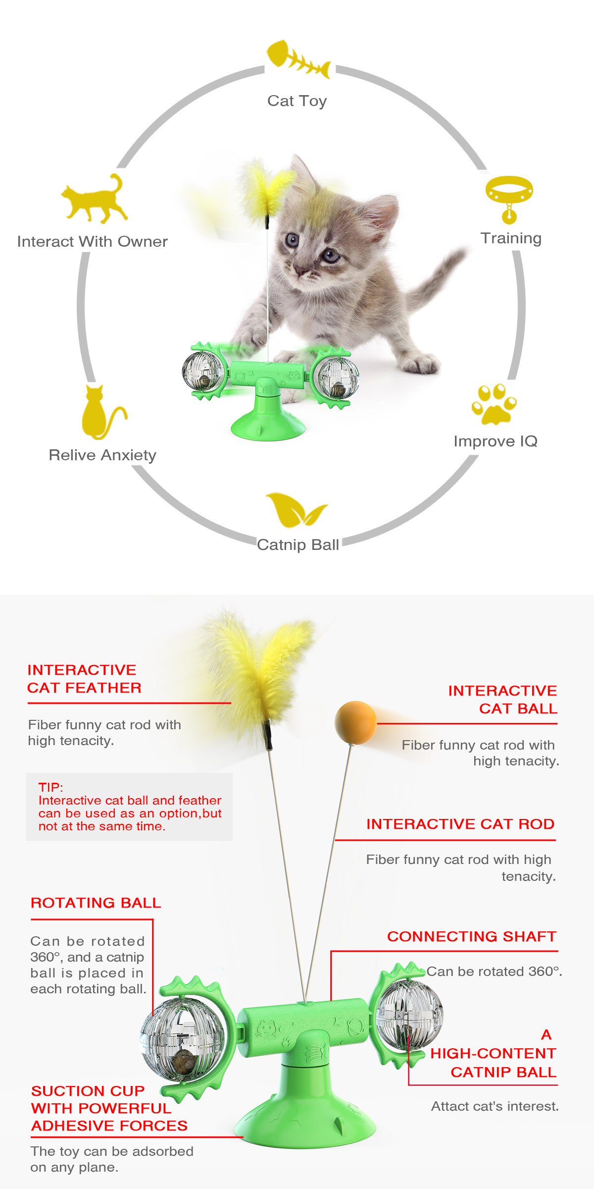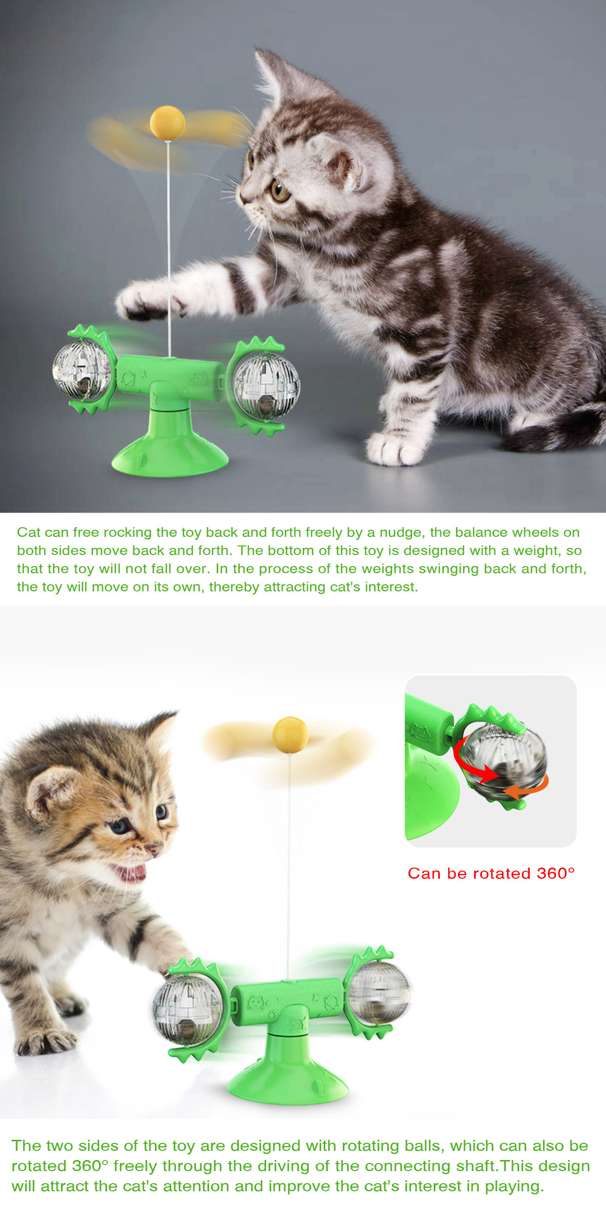 When the cat is playing, the toy can swing back and forth freely without falling over. Driven by the self-weight module at the bottom, the toy can be moved forward or backward by swinging. When the product is laid horizontally, the toy can also be rotated like a turntable, which greatly increases the cat's interest. It doesn't need any electric power.