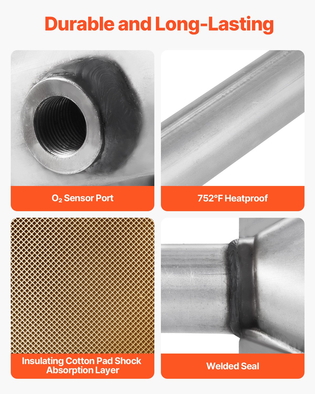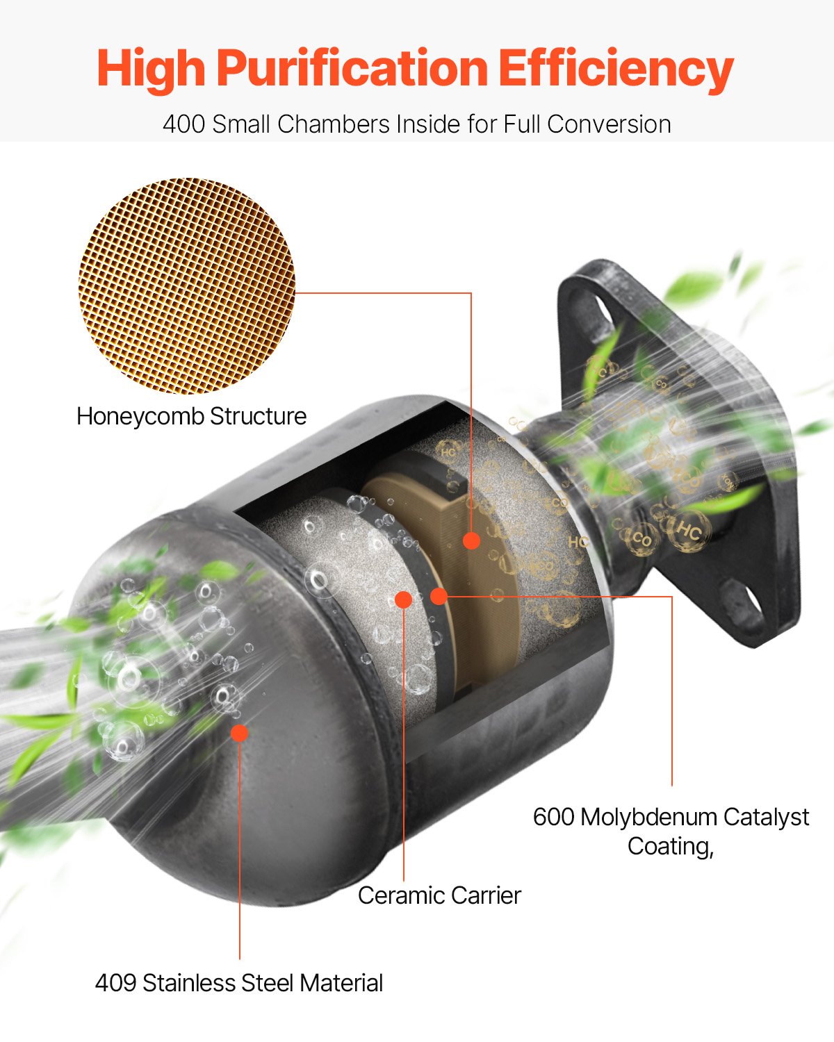 Stainless Steel Construction: The high flow catalytic converter is constructed with heavy-duty T409 stainless steel that is heat-proof and rustproof. It is designed to withstand high temperatures and pressure within the exhaust system, ensuring long-lasting durability without worries of bending or melting