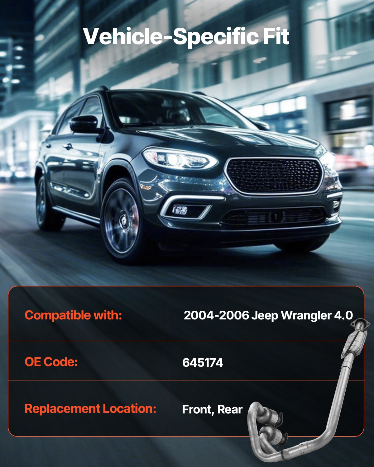Compatibility: Our catalytic converter is compatible with Jeep Wrangler 4.0L 2004-2006, Engine: 4.0L L6, Replacement Position: Front, Rear, OE Code: 645174. Please check your vehicle's brand and OE code for compatibility before purchase