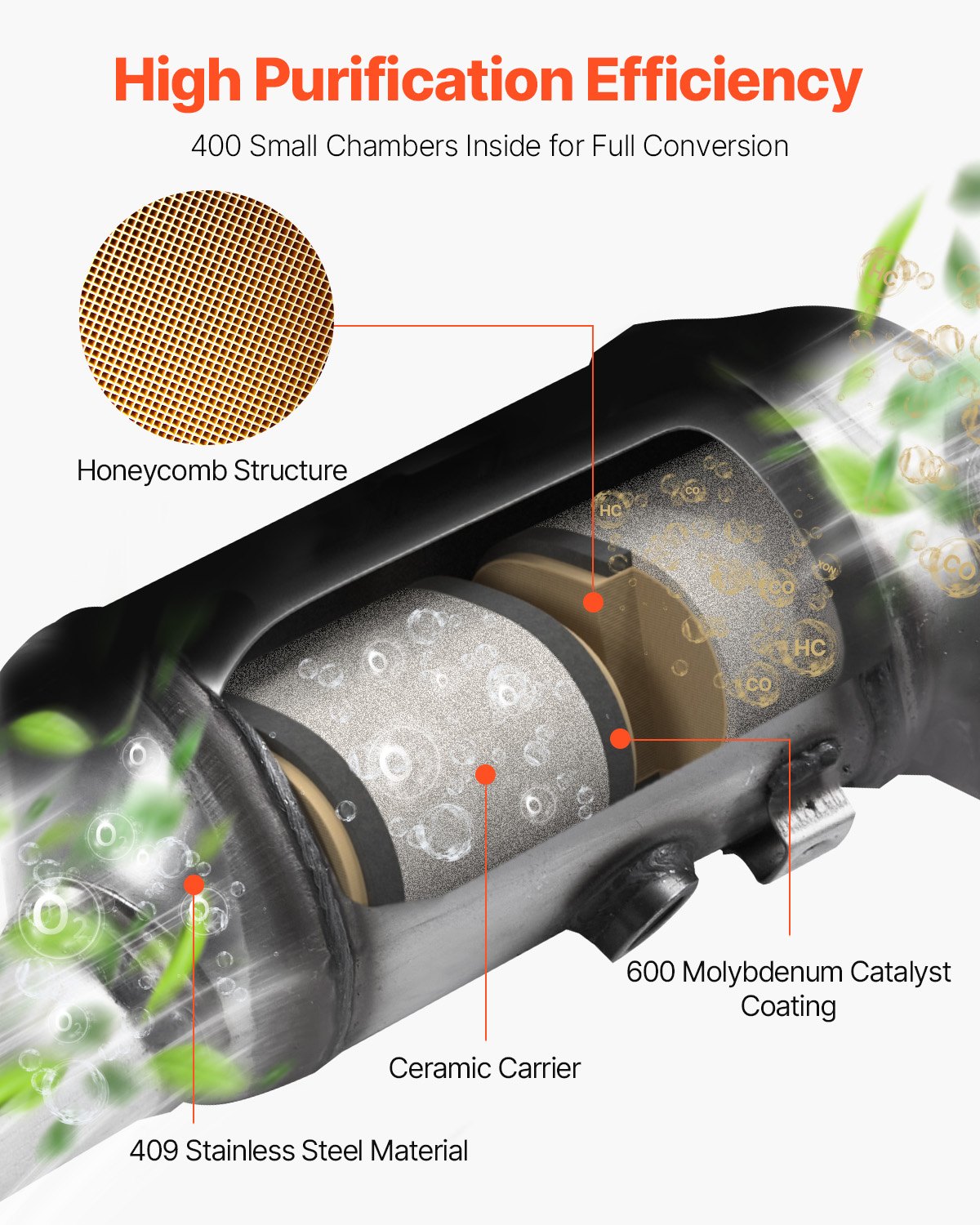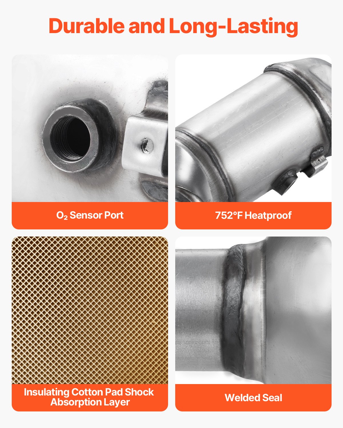 Stainless Steel Construction: The high flow catalytic converter is constructed with heavy-duty T409 stainless steel that is heat-proof and rustproof. It is designed to withstand high temperatures and pressure within the exhaust system, ensuring long-lasting durability without worries of bending or melting