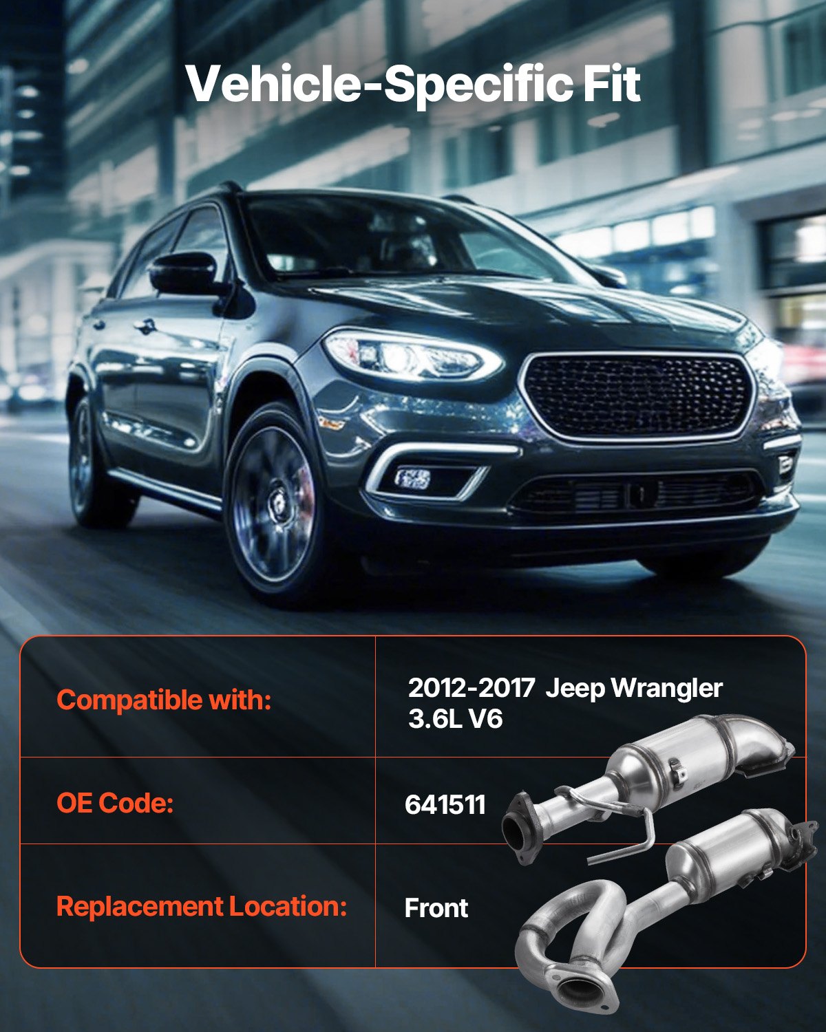 Compatibility: Our catalytic converter is compatible with Jeep Wrangler 3.6L V6 2012-2017, Engine: 3.6L V6, Replacement Position: Front, Left, Right, OE Code: 30585. Please check your vehicle's brand and OE code for compatibility before purchase