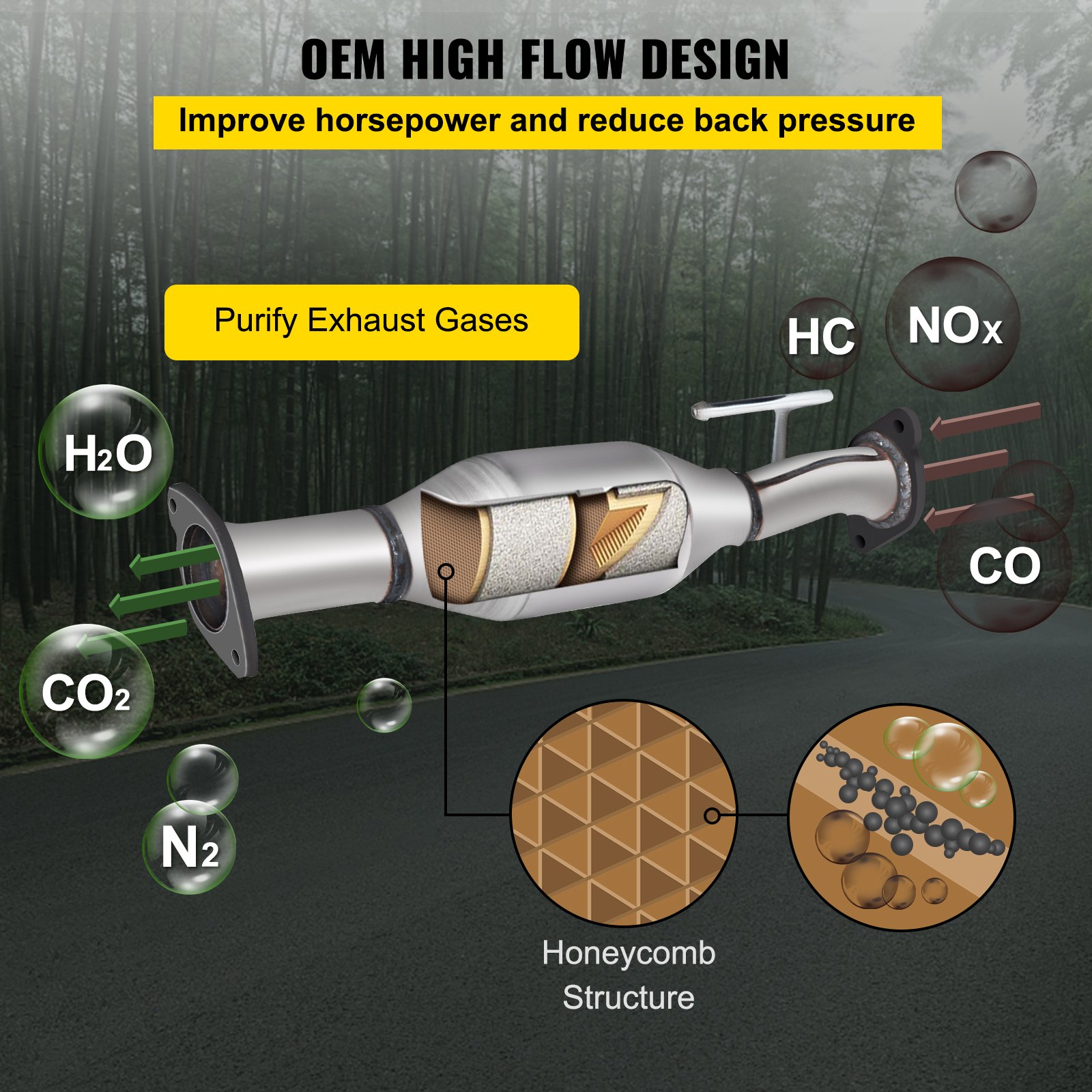 OEM High Flow Design: These catalytic converters are constructed to meet or even exceed OEM quality and have EPA certification. The high flow design provides more oxygen to your engine, dramatically improving your exhaust system. Further, an internal honeycomb structure effectively purifies the waste gases, converting CO, HC, and NOx into CO₂, H₂O, and N₂.