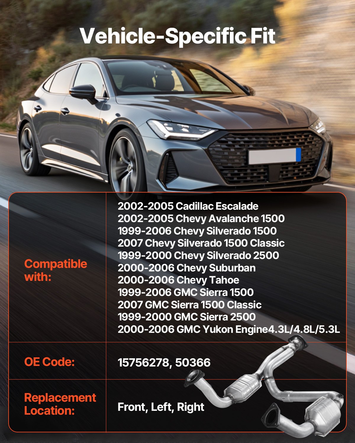 Compatibility: Our catalytic converter is compatible with Chevrolet Silverado 1500 1999-2006 (for more models, refer to the product description page), Engine: 4.3L V6, 4.8L/5.3L V8, Replacement Position: Front, Left, Right, OE Code: 15756278, 50366. Please check your vehicle's brand and OE code for compatibility before purchase
