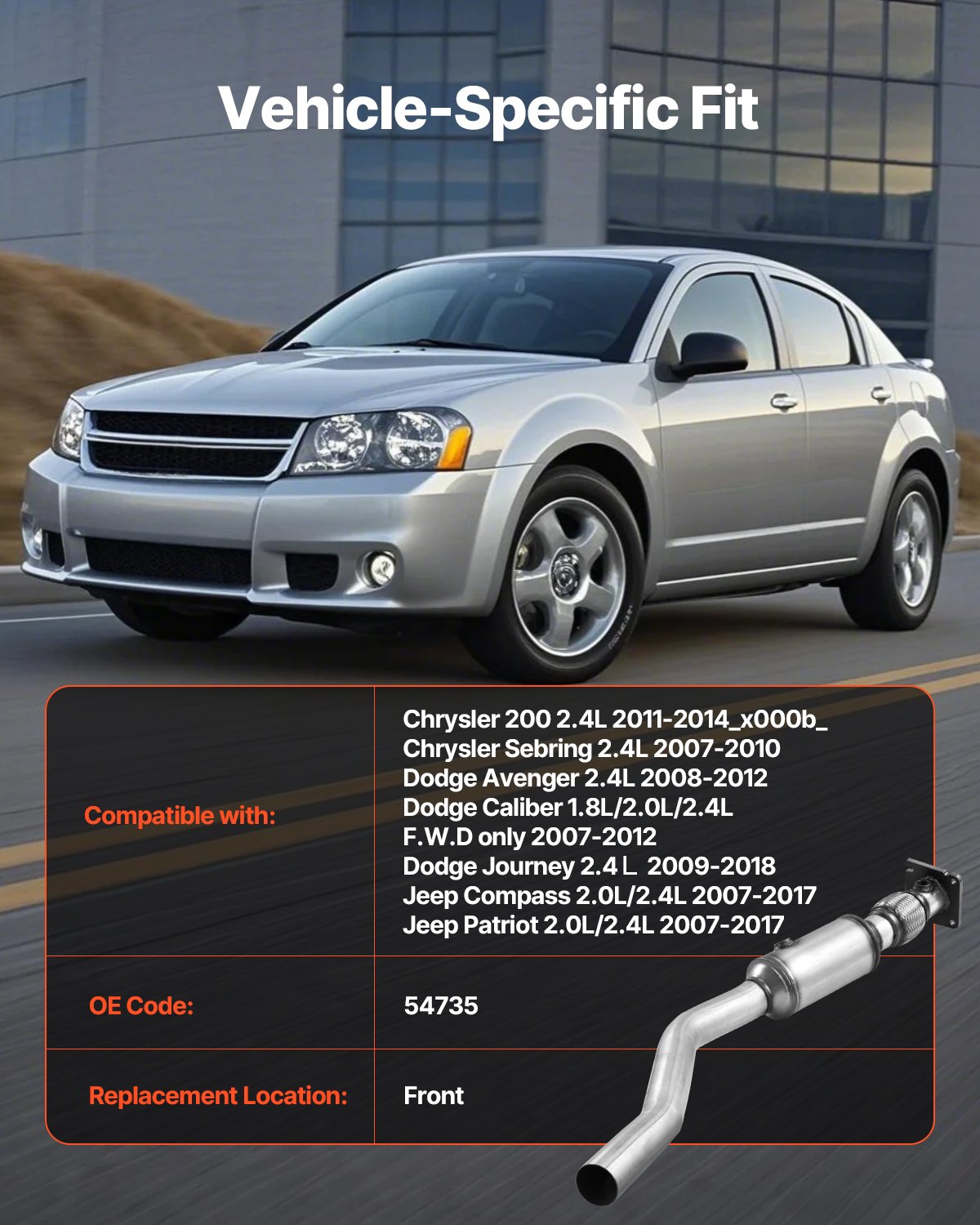 Compatibility: Our catalytic converter is compatible with Dodge Journey 2.4L 2009-2018 (for more models, refer to the product description page), Engine: 2.4L L4, Replacement Position: Front, OE Code: 54735. Please check your vehicle's brand and OE code for compatibility before purchase