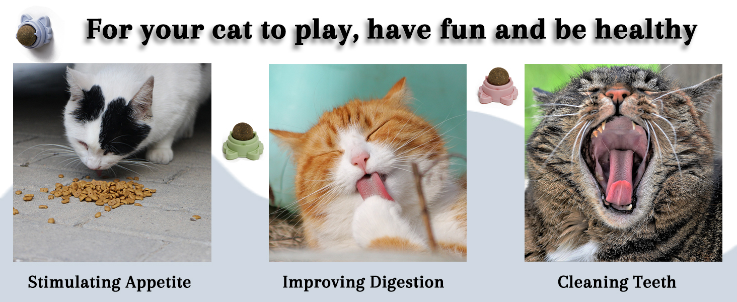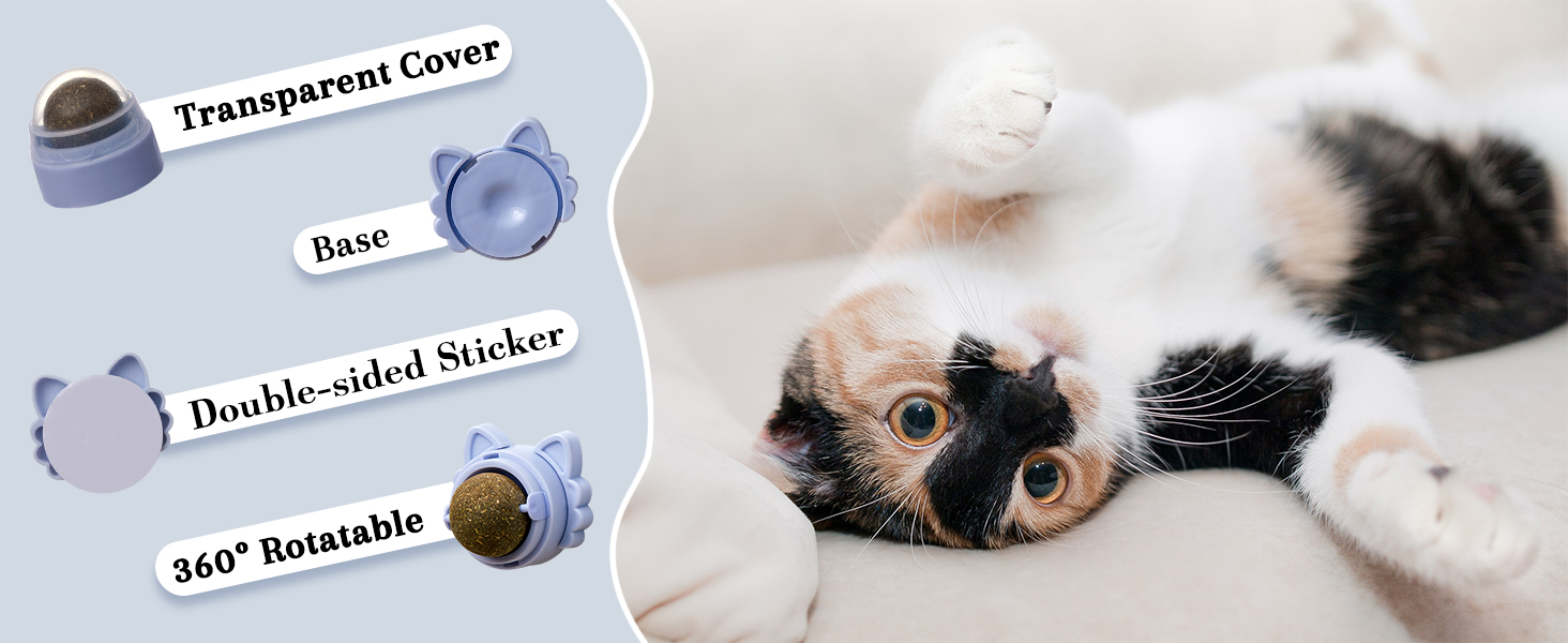 [Practical Design]: The cat toy can easily stick to the wall or other surfaces with strong viscous force, no falling off when your kitten licks and plays. Such as wall, chair foot, floor and so on. 3 balls are 360° rotatable when being licked.