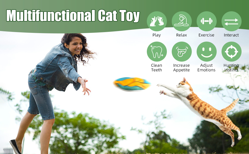 【Interactive Flying Disc】Our interactive cat toys provide opportunities for chase play, the sports ball pattern, flat shape design, so that it can also look like a flying disc, throw it! This cat flyer toy stimulates their hunting instincts, reduces boredom and provides exercise.