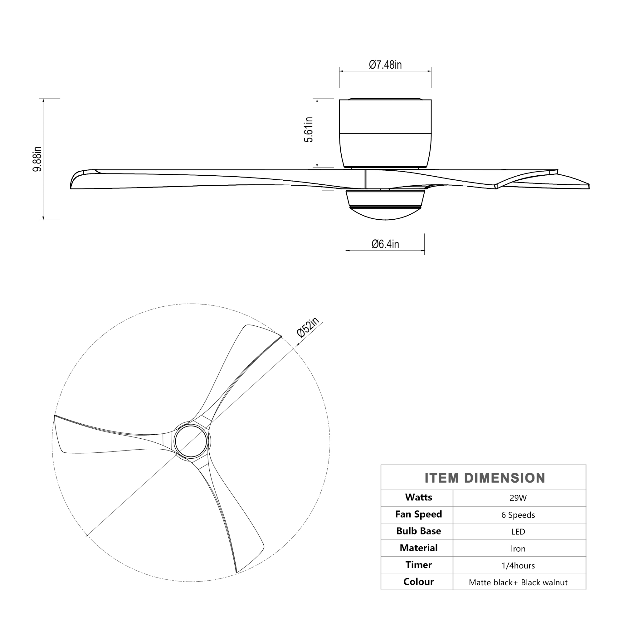 Product Name:52" Ceiling Fan with Lights Remote Control,Quiet DC Motor 3 Blade Ceiling Fans 6 Speed Levels,Reversible Ceiling Fan, for Patio Living Room, Bedroom, Office,Indoor.(Matte Black +Black Walnut )