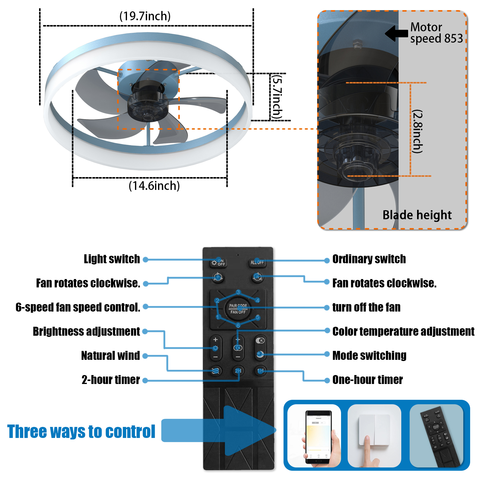 Fan Fan - After factory balancing and noise testing, each fan blade rotates without any noise (fan operation noise: 21 decibels). In a noisy environment, it improves sleep quality. Adjustable wind speed - With the illuminated ceiling fan, it can enhance air circulation. Low wind speed range, resulting in less air resistance and a gentle, smooth natural breeze. There are 6 wind speed options available: low/medium/high. *Adjustable light ceiling fan lamp - The ceiling fan lamp can switch between 6000K white light, 4500K neutral light, and 3000K warm light through lighting.