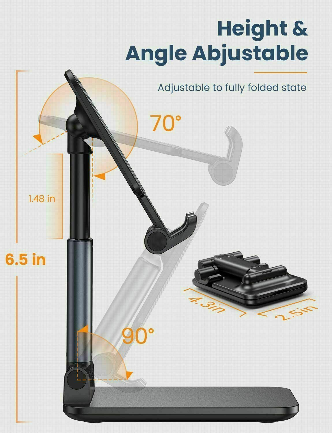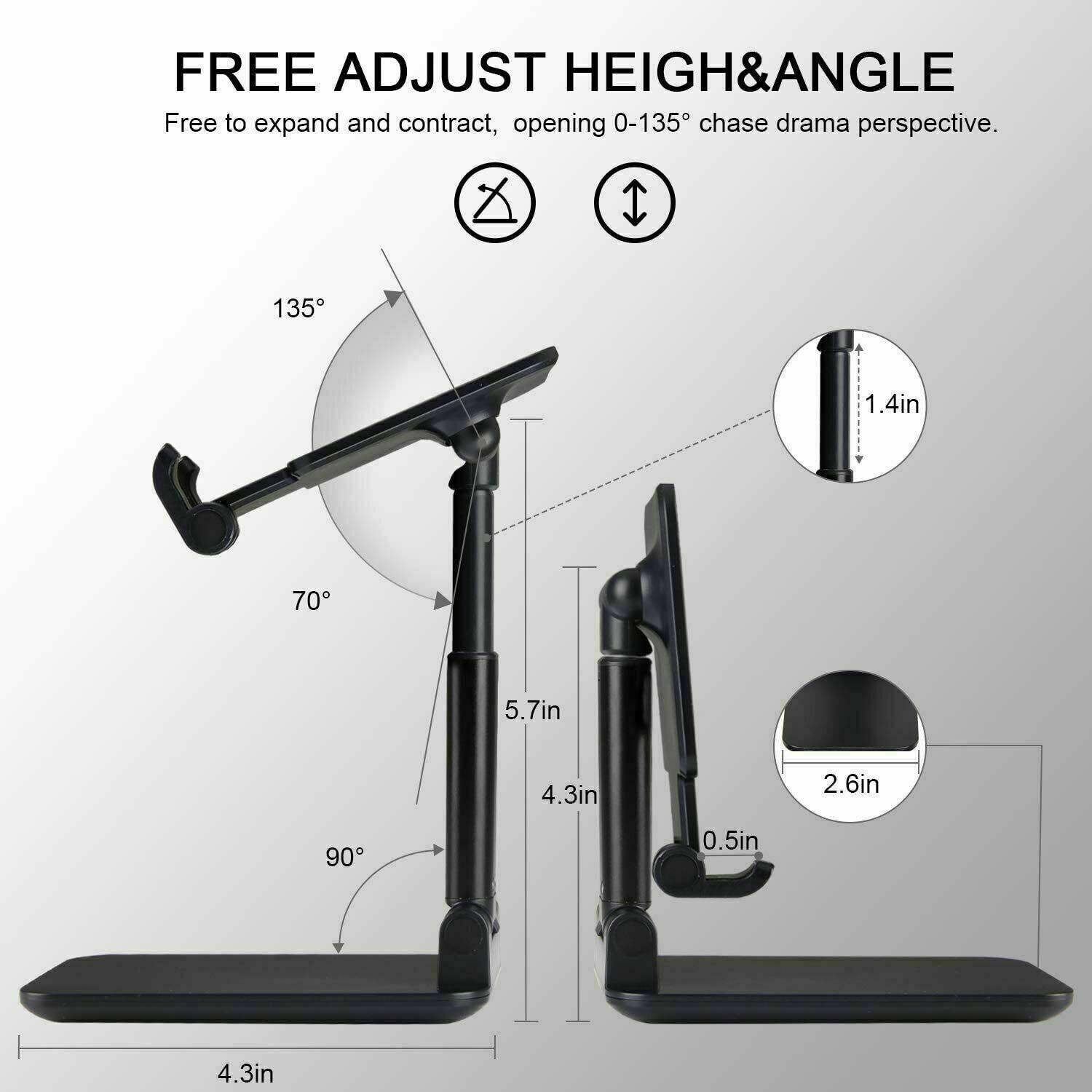【ANGLE & HEIGHT ADJUSTABLE】The desktop phone holder stand can be adjusted from 4.3” to 6.3”,easily extendable in height. Also, it allows you to customize the angle of your device flexibly to find the most comfortable viewing angle. Reduce the frequency of looking down at the phone screen to avoid hurting your back and neck.