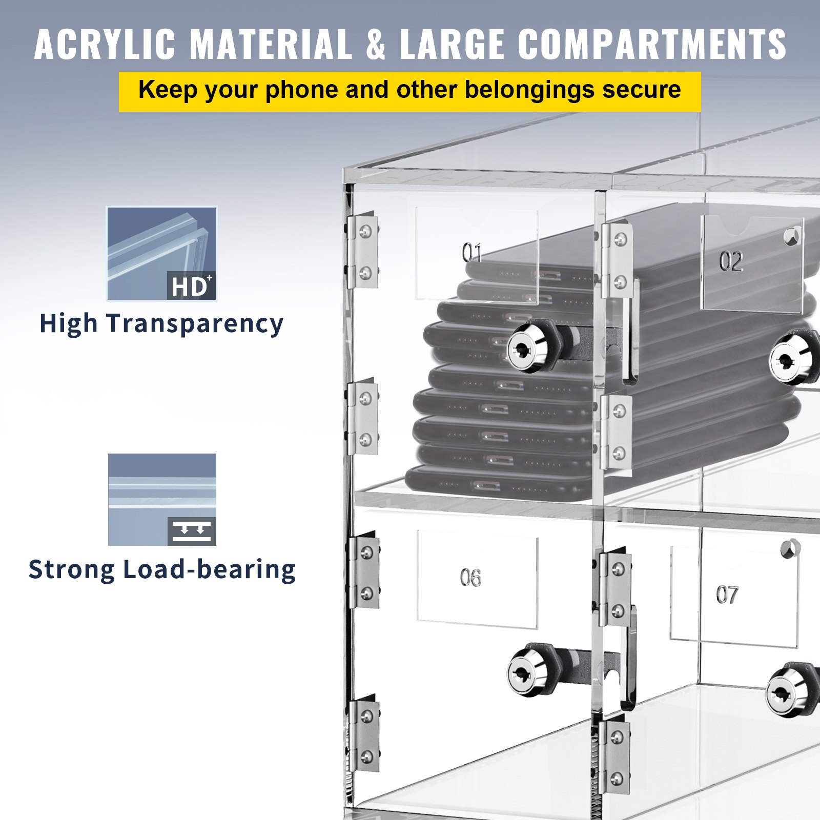 Clear Acrylic & Large Capacity: Our cell phone locker is made of high-quality acrylic, which is not easy to deform and guarantees a long service life for the cabinet. Each slot measures 3.9" W x 7" D x 3.9" H. The compartment size is suitable for 99% of mobile phones on the market. Securely hold your phones, wallets, and other belongings.