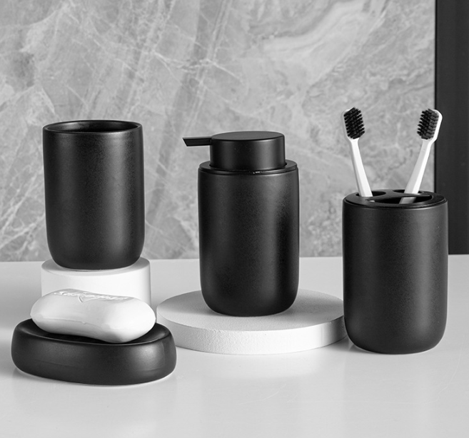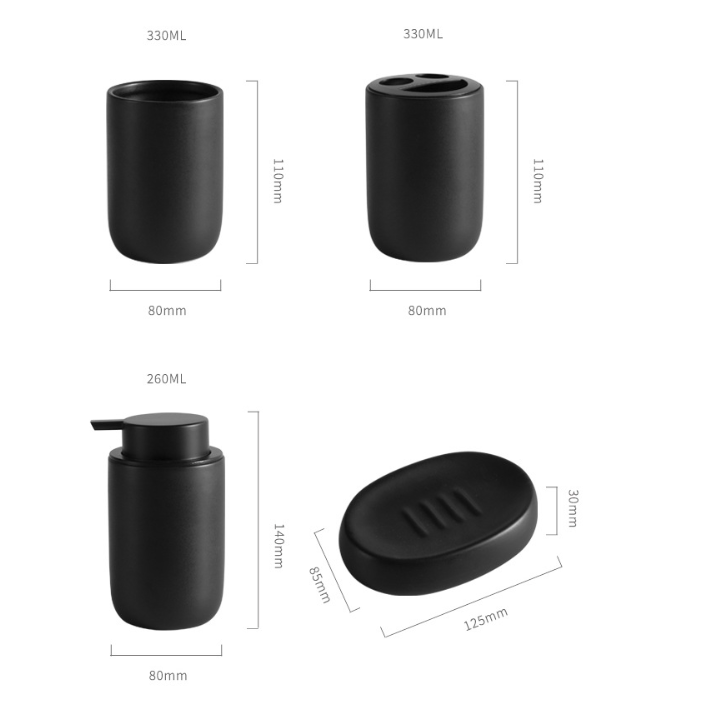Specifications: White press bottle, white toothbrush holder, white mouthwash cup
