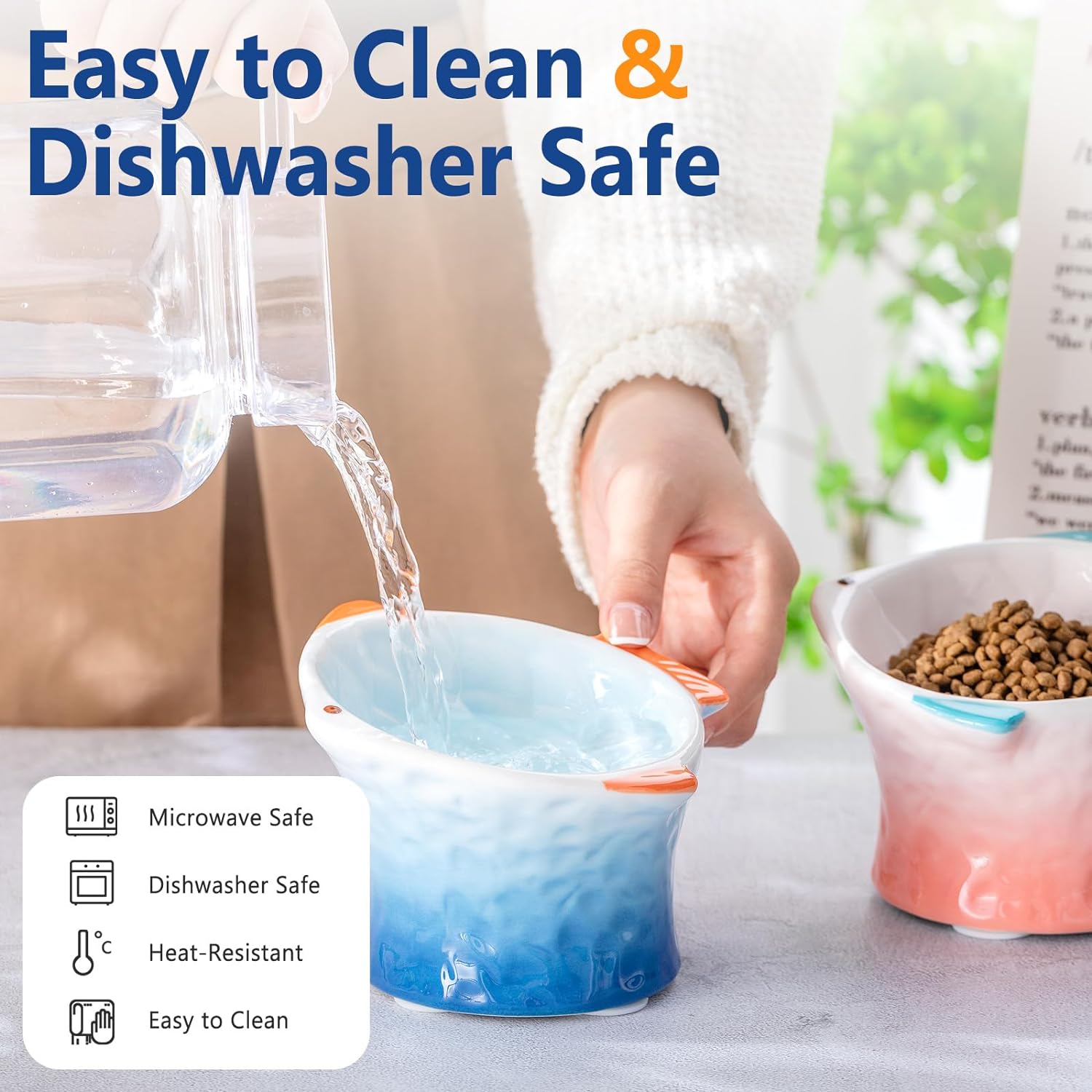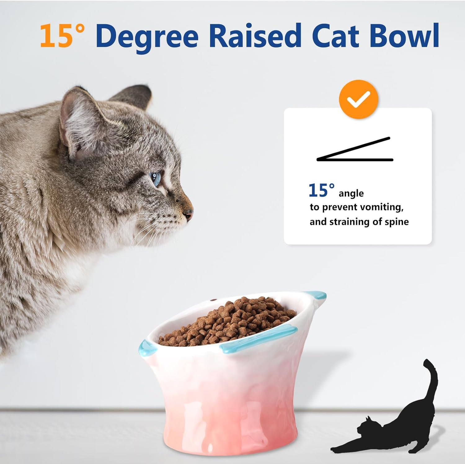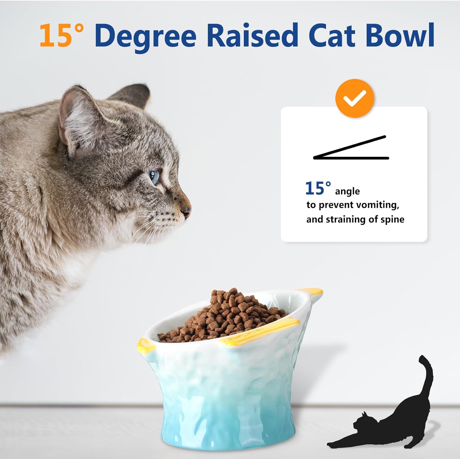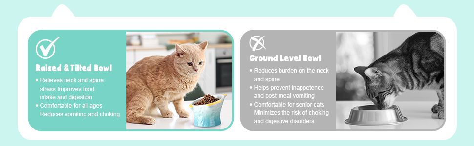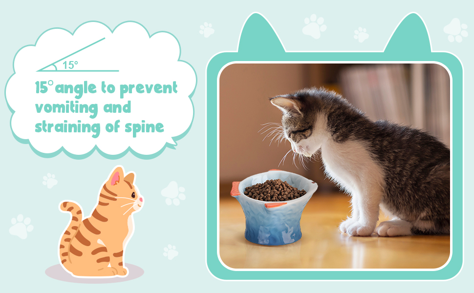 15 Degree Tilt Angle Design: these raised cat food bowls feature a 15 degree tilt angle design, promoting scientific feeding and reducing the risk of your cat vomiting; This ingenious design enables easy swallowing, alleviating occasional digestive discomfort and improving digestion; By reducing the burden on your cat's neck, this design ensures a more comfortable eating posture, and the tilted angle also keeps the food in the center, avoiding spillage and ensuring a good feeding experience