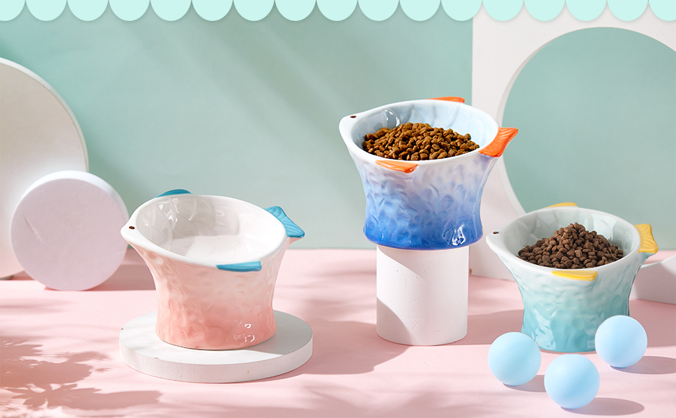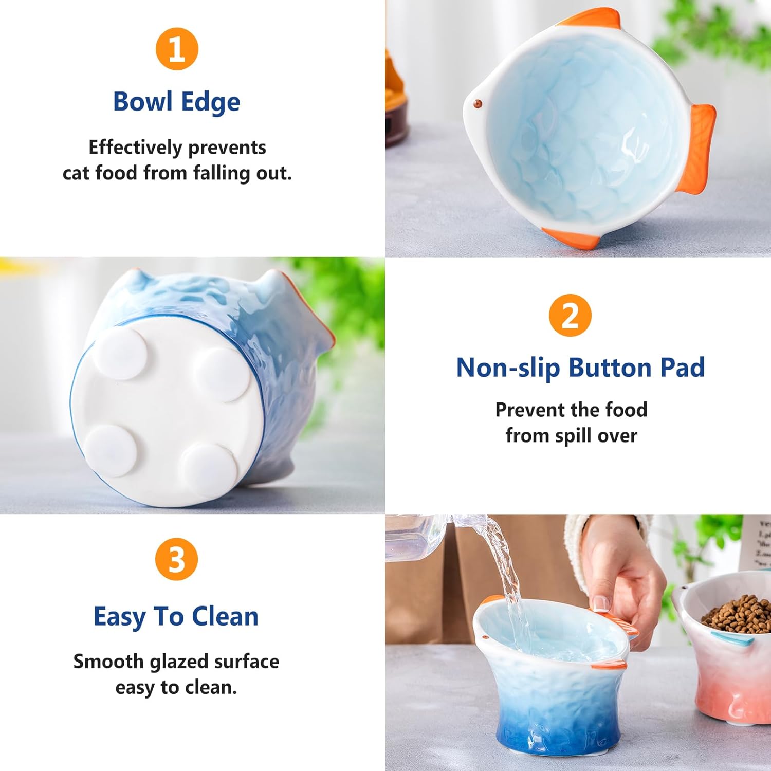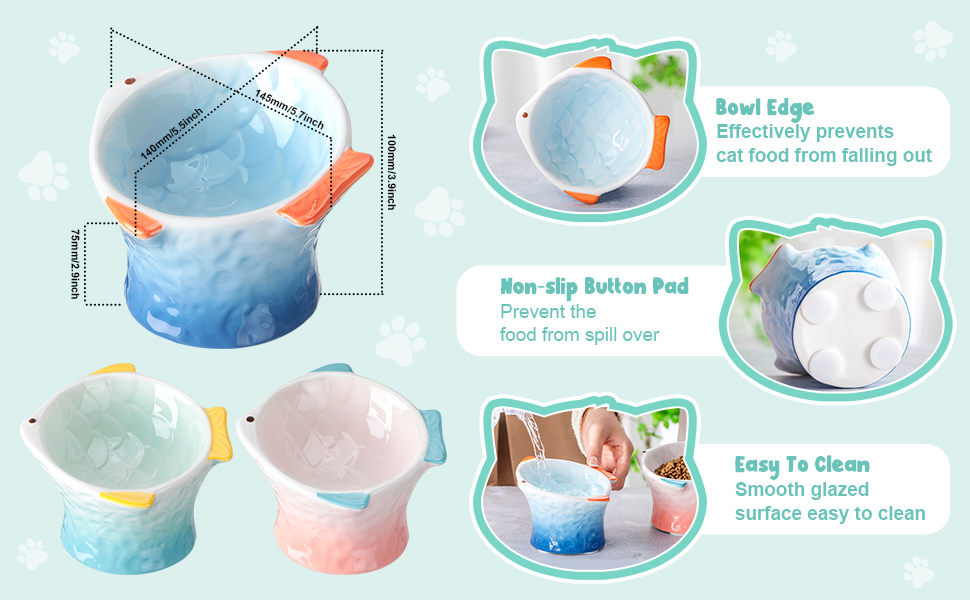 Suitable Size and Capacity: with an overall size of about 145*140*100mm these fish shaped ceramic elevated cat bowls are a good fit for your cat's feeding area; The compact size allows for easy placement, saving space in your home; Each bowl has a capacity of about120ml, providing ample room for a sufficient amount of food; Whether it's wet or dry food, these cat food bowls can accommodate various types of cat food