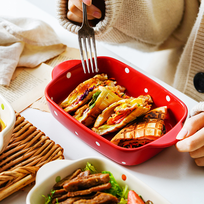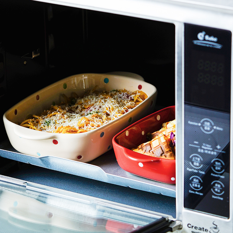 Color: square baking pan—red dots, square baking pan—beige dots, square baking pan—yellow dots, square baking pan—green dots, large rectangular baking pan—beige dots, large rectangular baking pan— Yellow dots, large rectangular baking tray-green dots