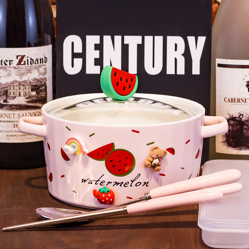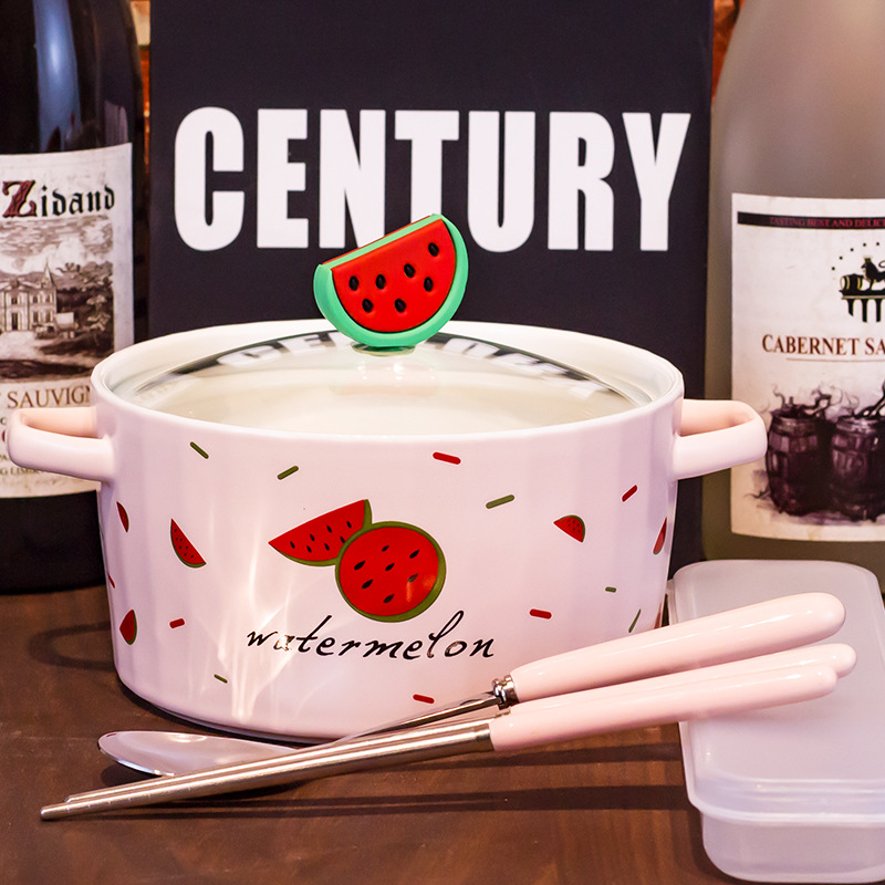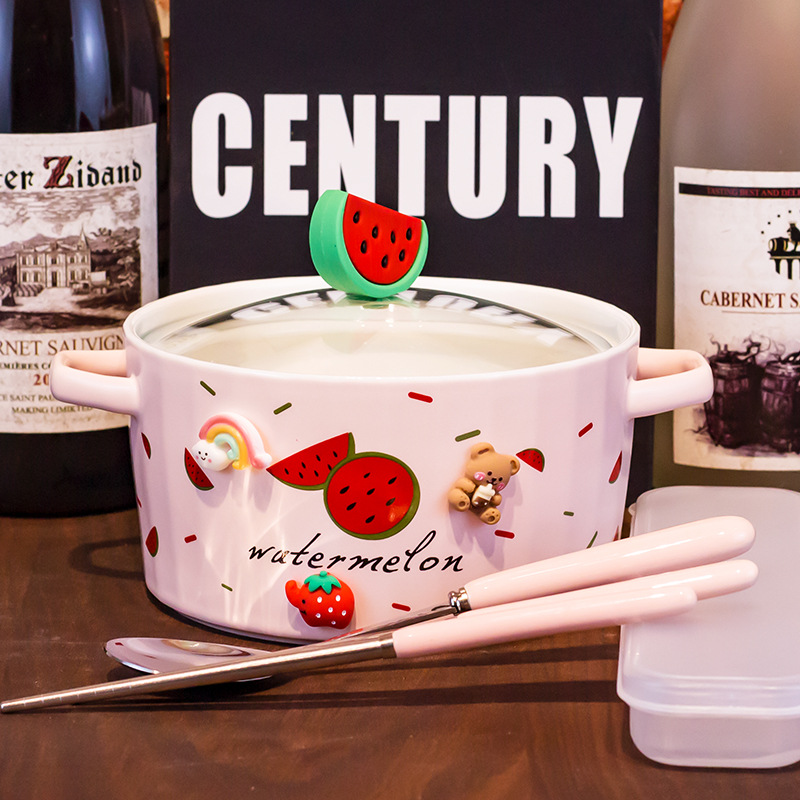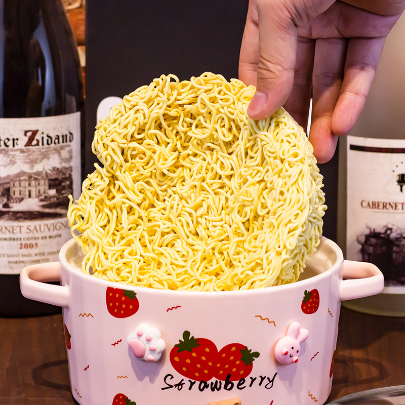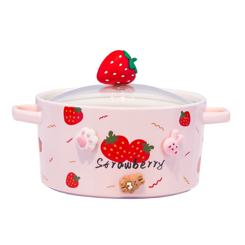 Ceramic Instant Noodle Bowl Good-looking Strawberry With Lid And Ears Easy To Clean