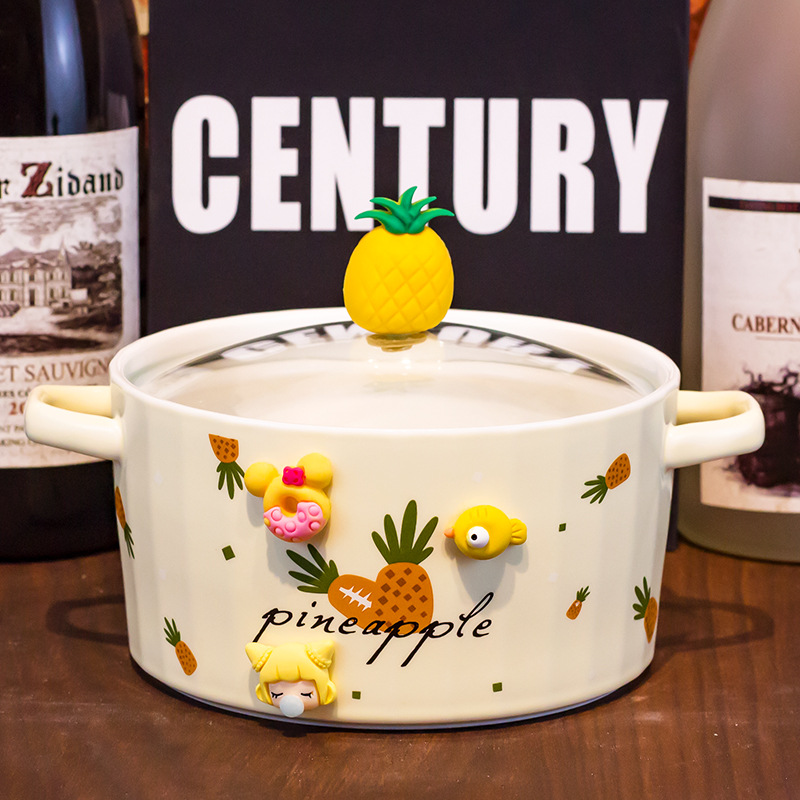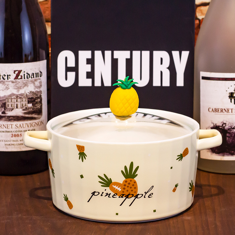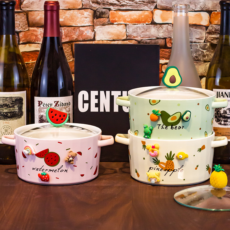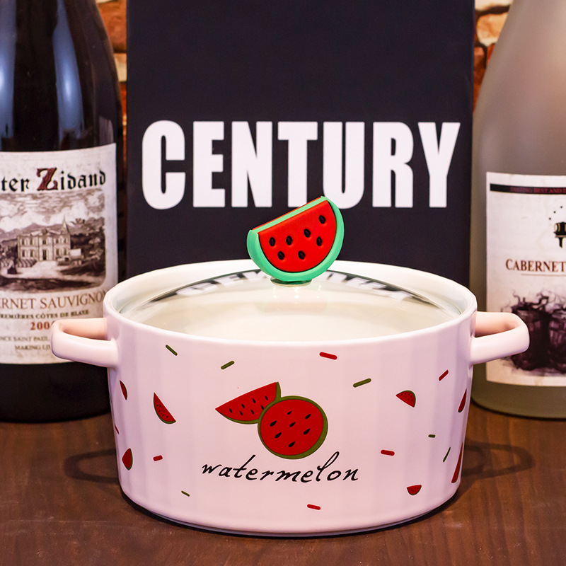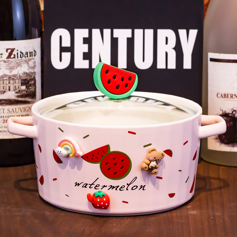 Ceramic Instant Noodle Bowl Good-looking Strawberry With Lid And Ears Easy To Clean
