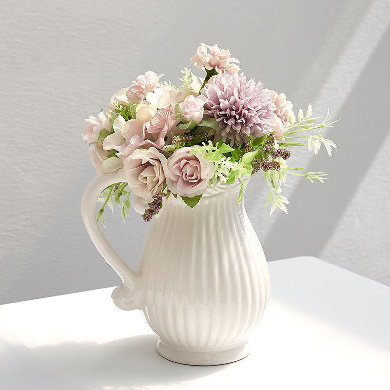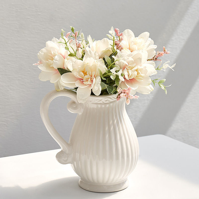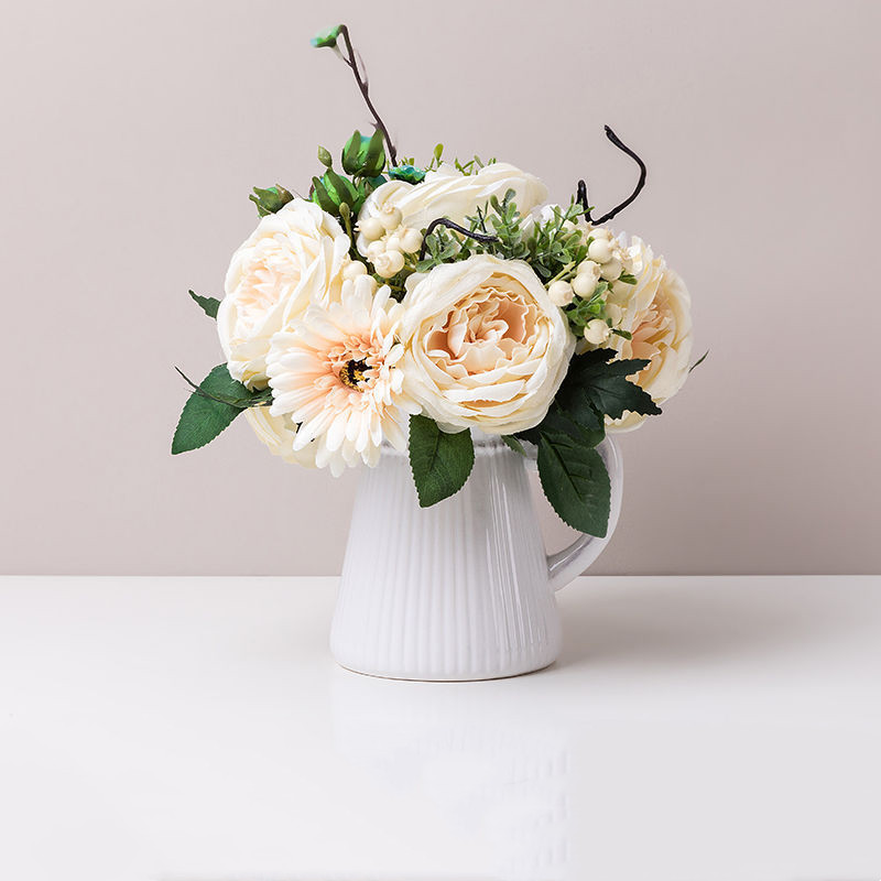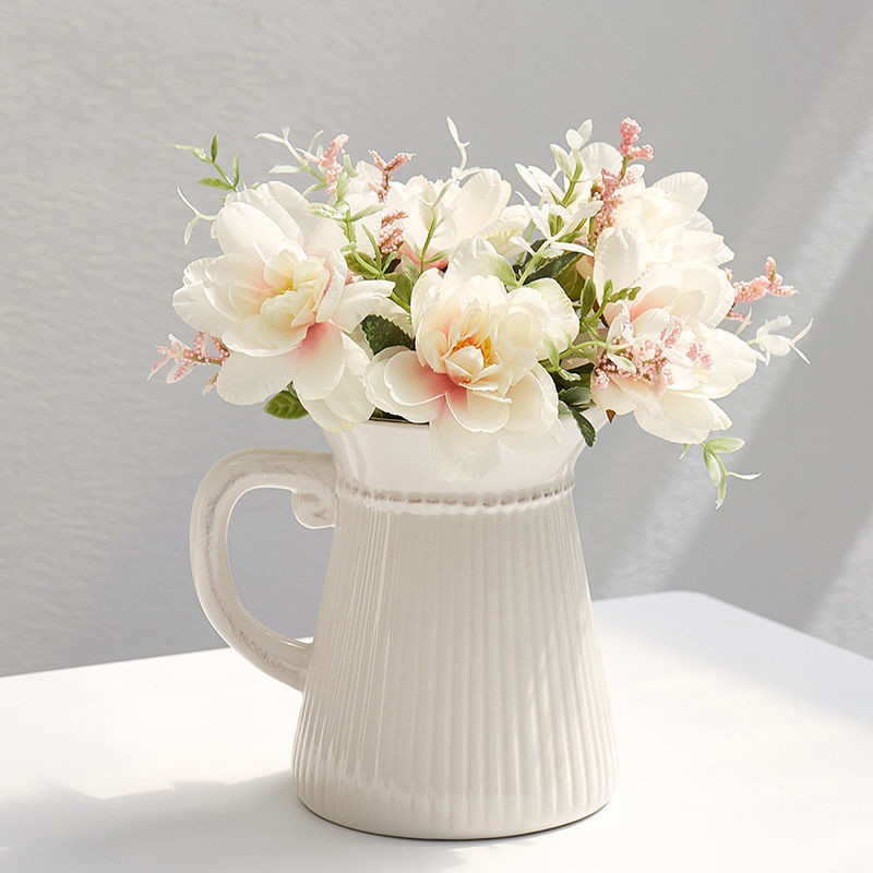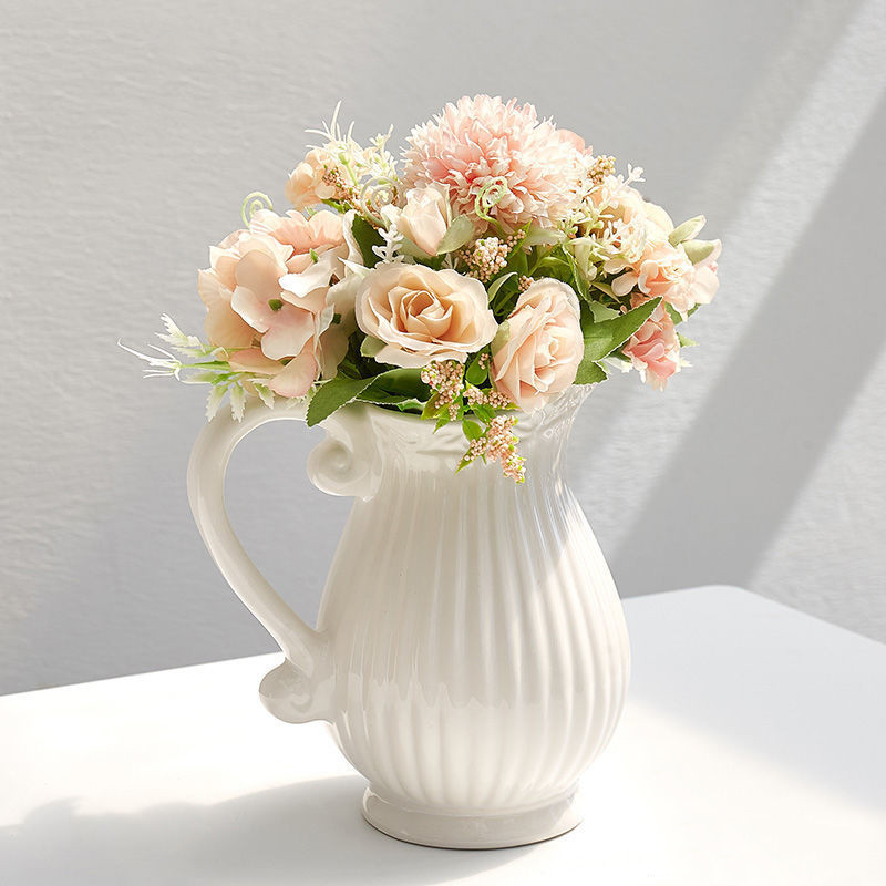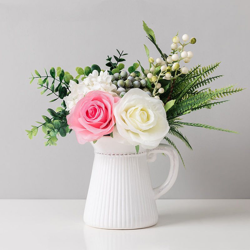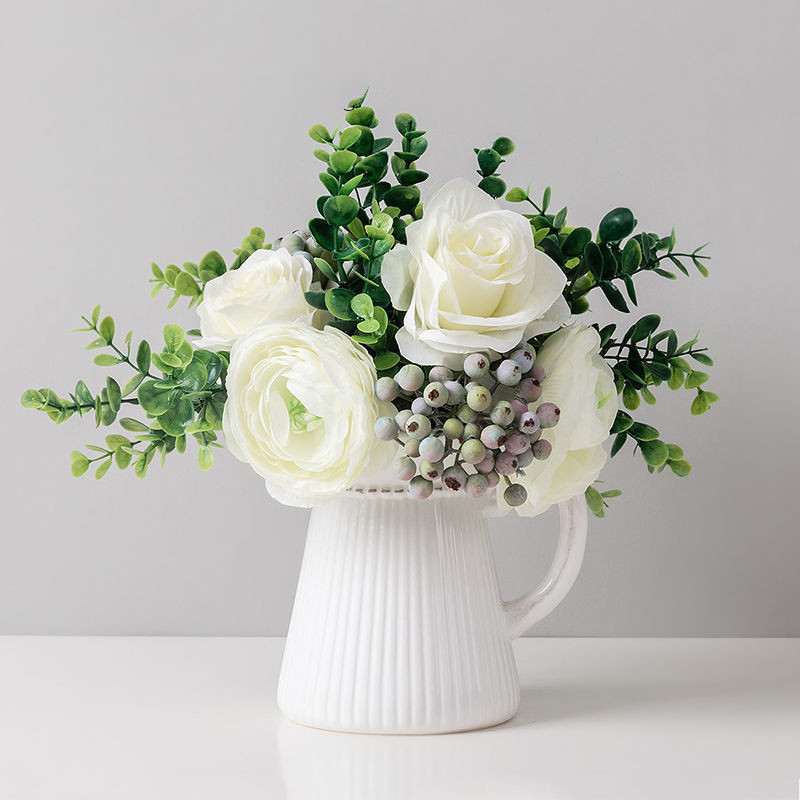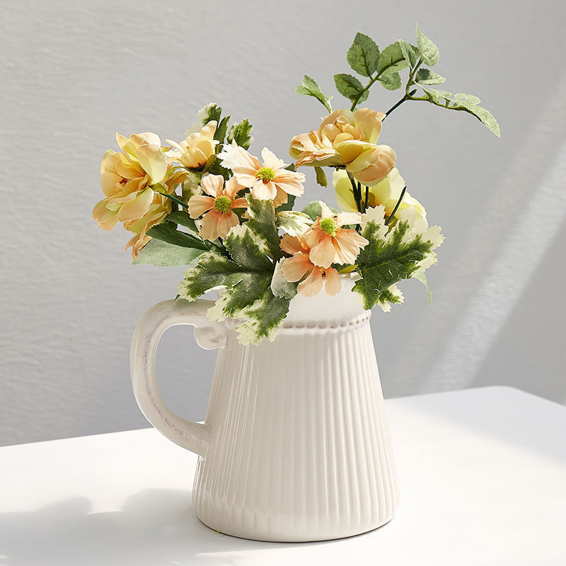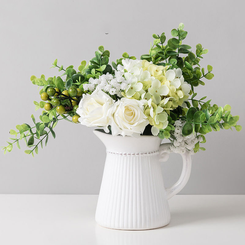 The creamy white vase reveals a touch of elegance and low-key, and the details are portrayed in a western style and elegant, and it is very beautiful with the green leaf floral art.