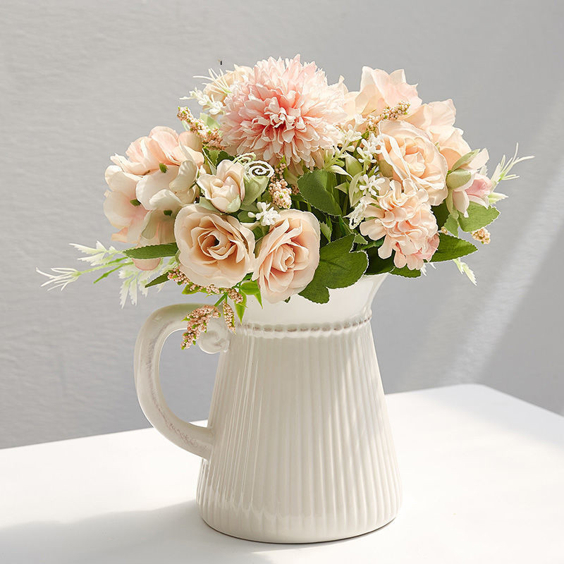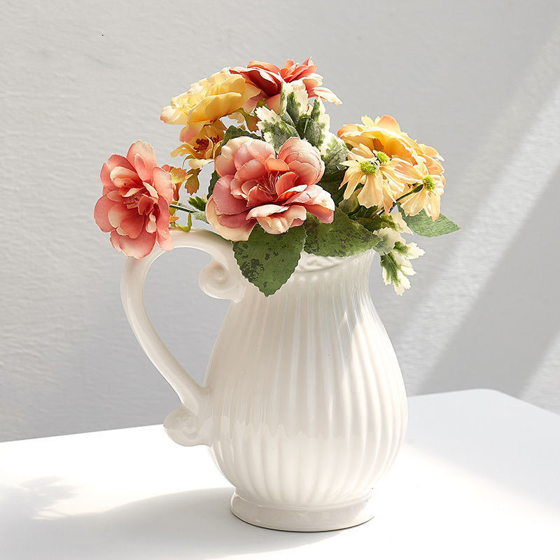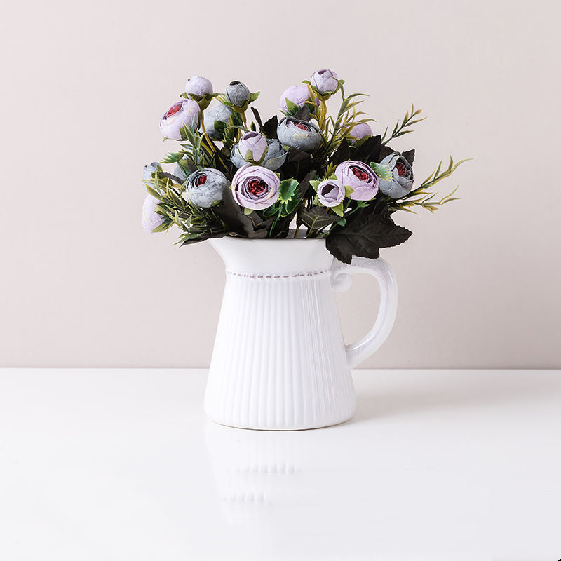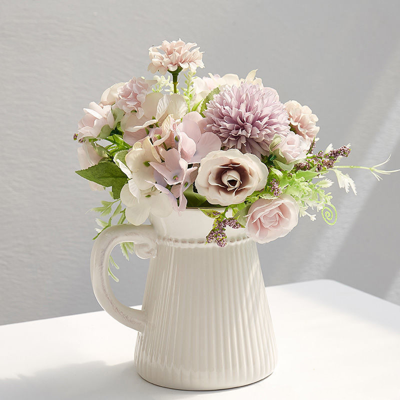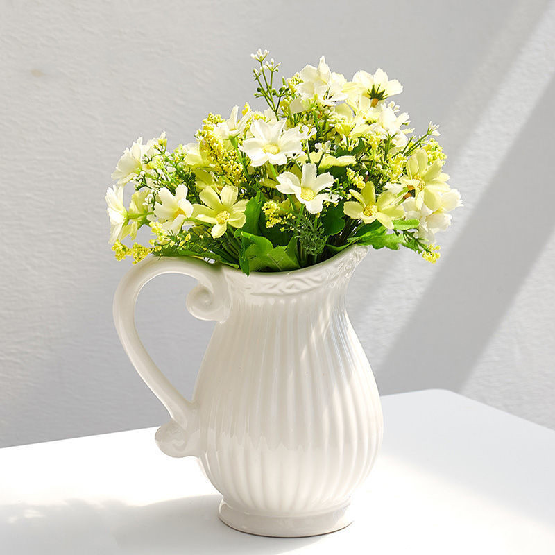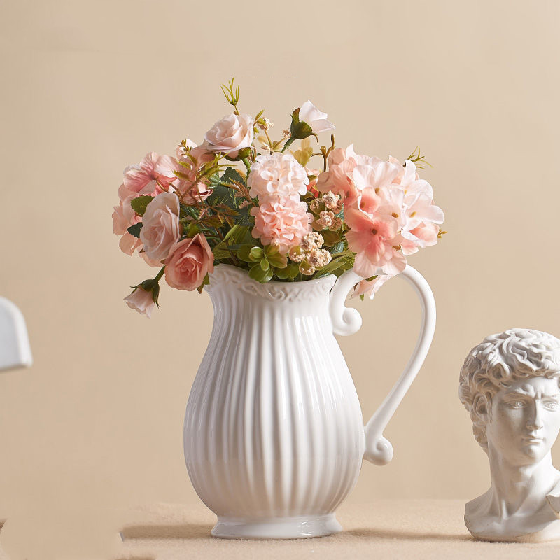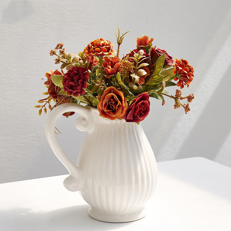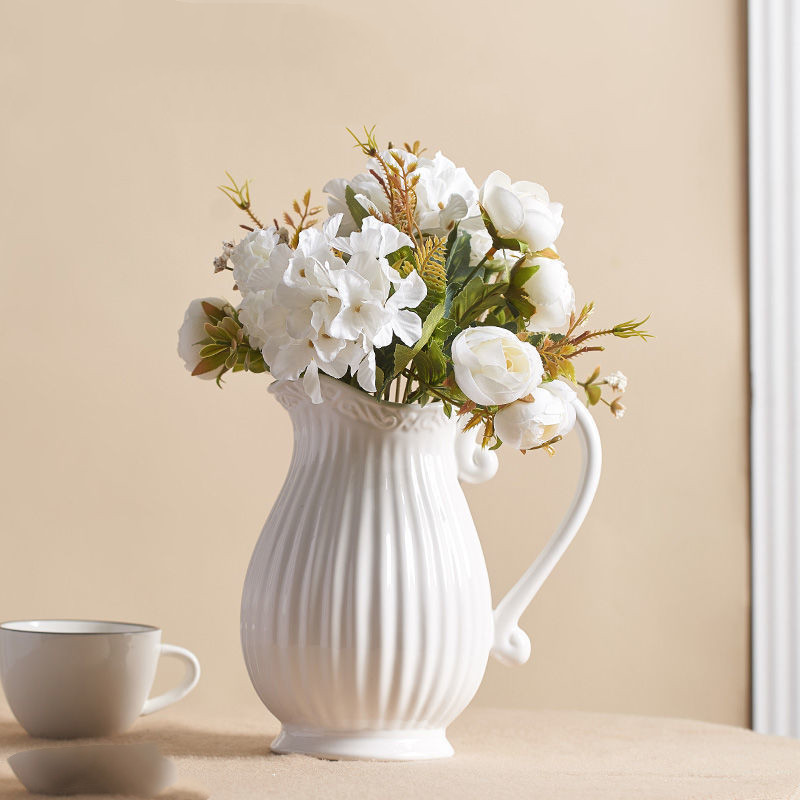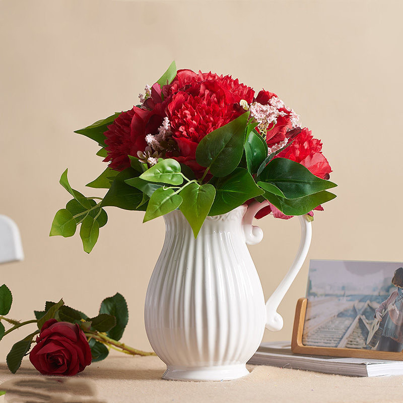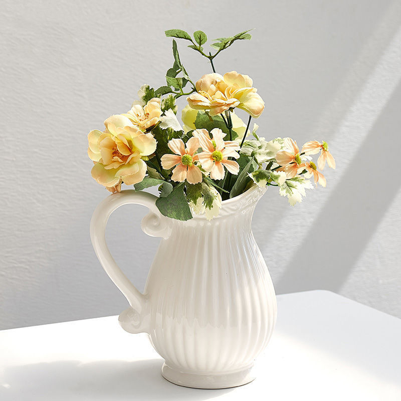 The creamy white vase reveals a touch of elegance and low-key, and the details are portrayed in a western style and elegant, and it is very beautiful with the green leaf floral art.