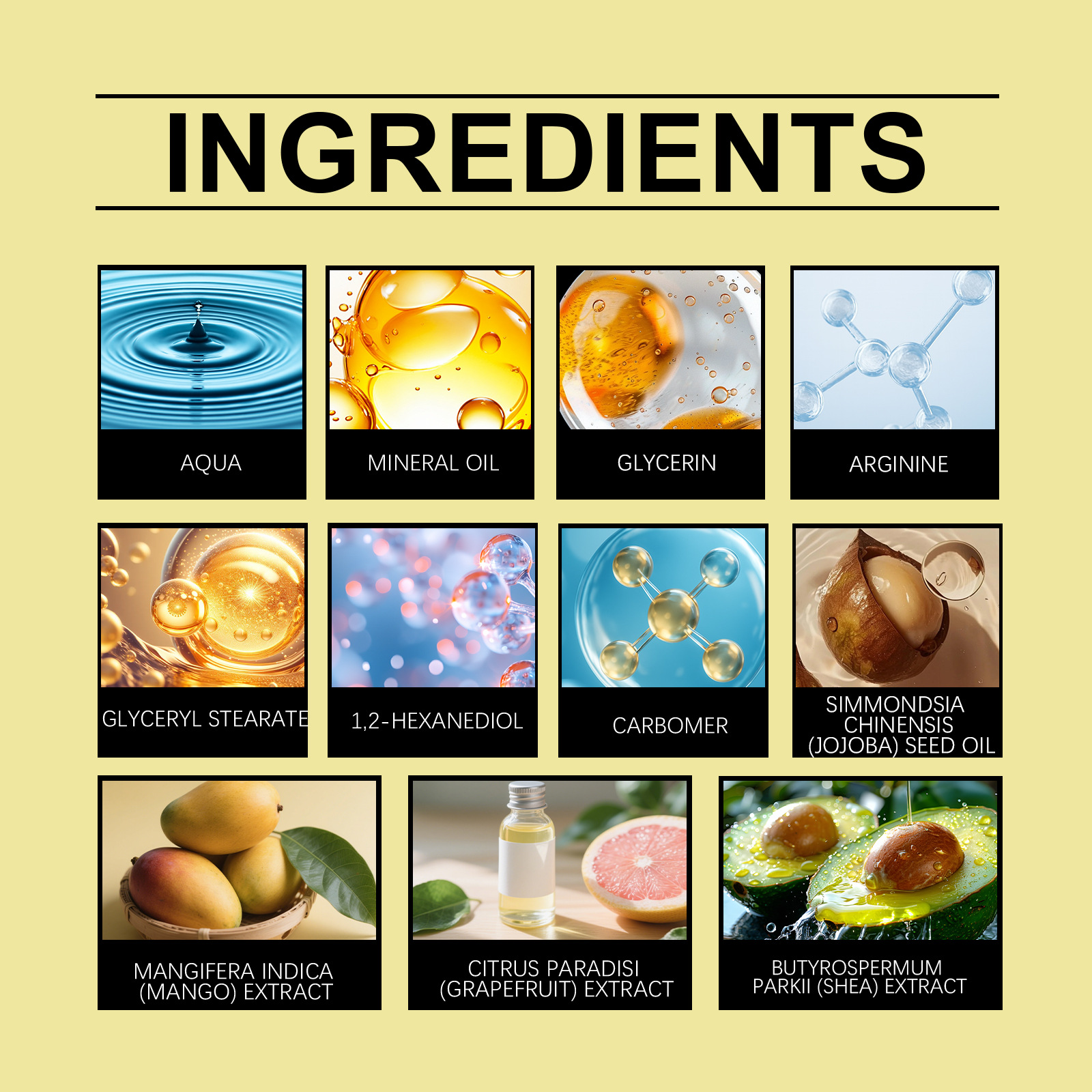 Ingredients :Water, Mineral Oil, Glycerin, Glyceryl Stearate, 1,2-hexanediol, Carbomer, Arginine, Jojoba Seed Oil, Mango Extraction, Grapefruit Extract, Butter Fruit Tree Extract