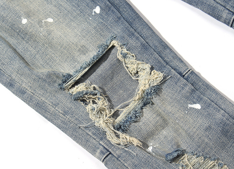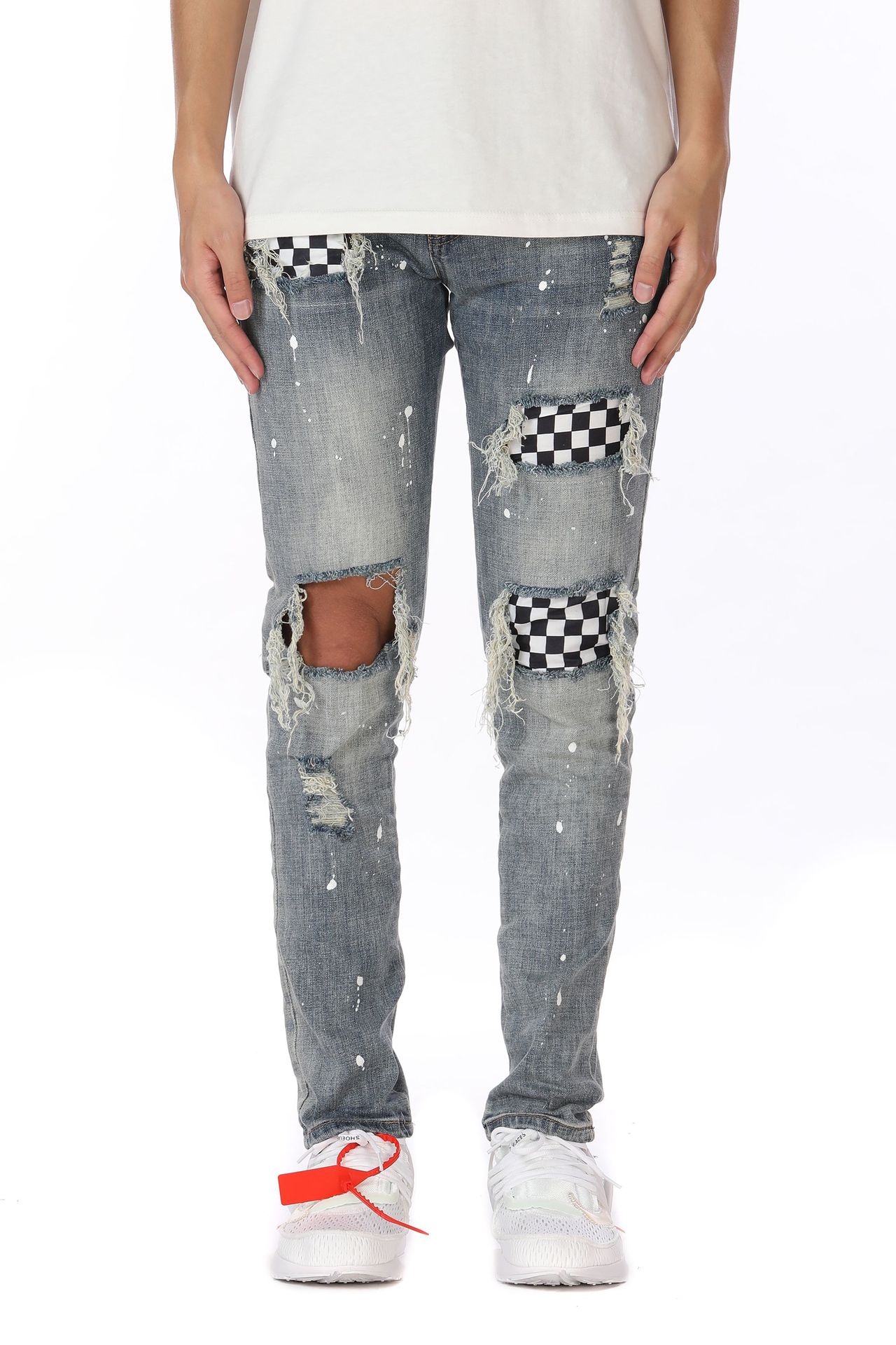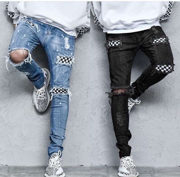 Checkered Checkerboard, Ripped Holes, Slim-Fit Micro-Elastic Jeans