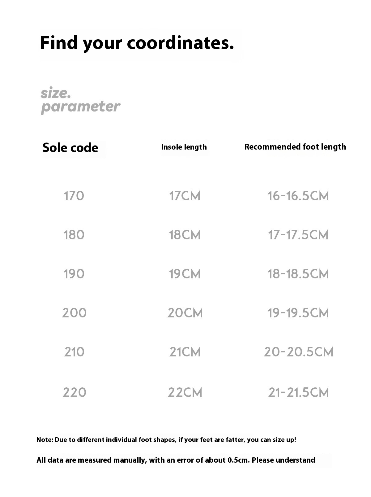 Size: [170] inner length 17cm,[180] inner length 18cm,[190] inner length 19cm,[200] inner length 20cm,[210] The internal length of the code is 21cm,[220] The internal length of the code is 22cm, the internal length of the adult model [35/36] is 23cm, and the internal length of the adult model [37/38] is 24cm