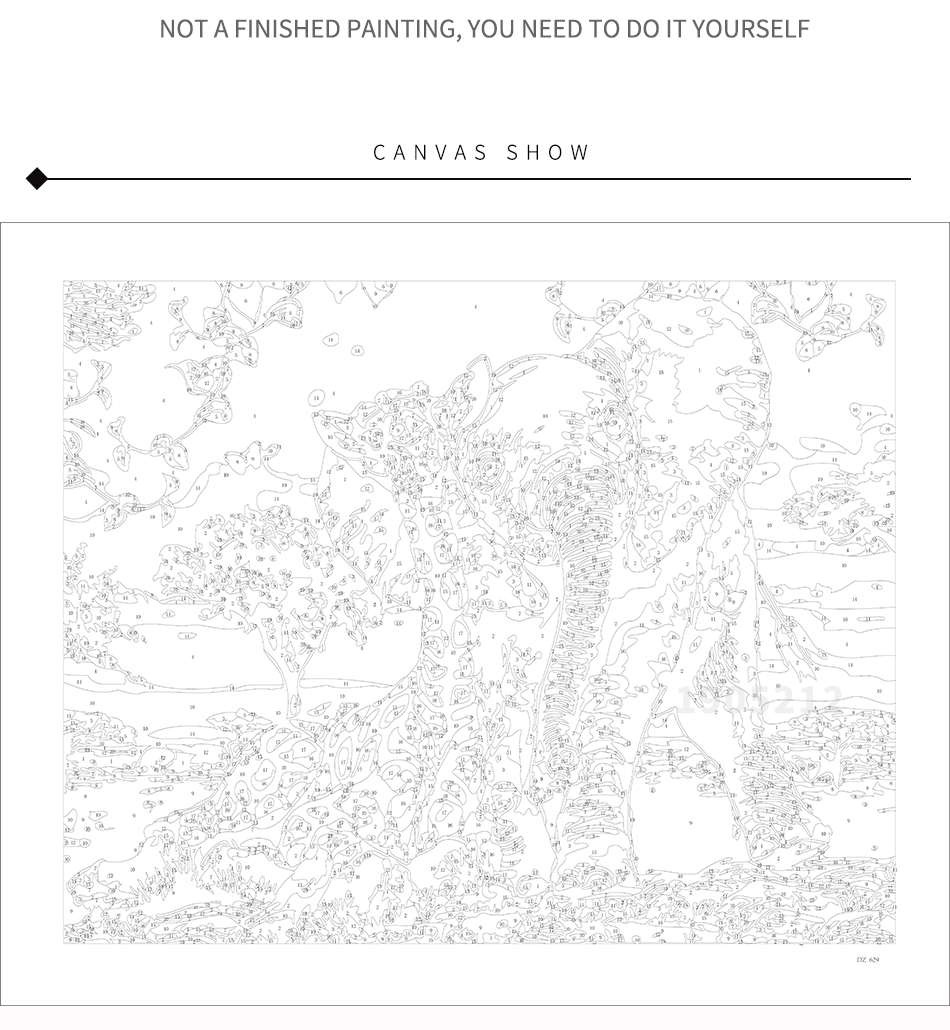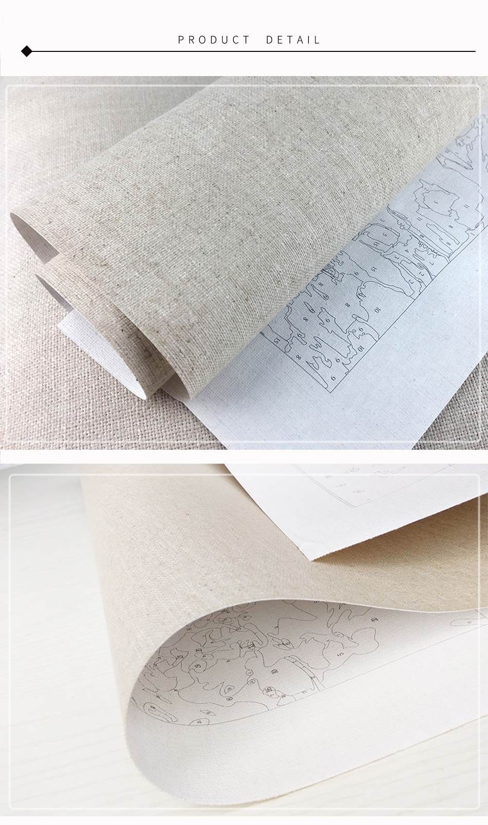 What's in: Linen canvas; 3 brushes; 1 set of acrylic paint; instruction file; reference table; frame; pendant; screw