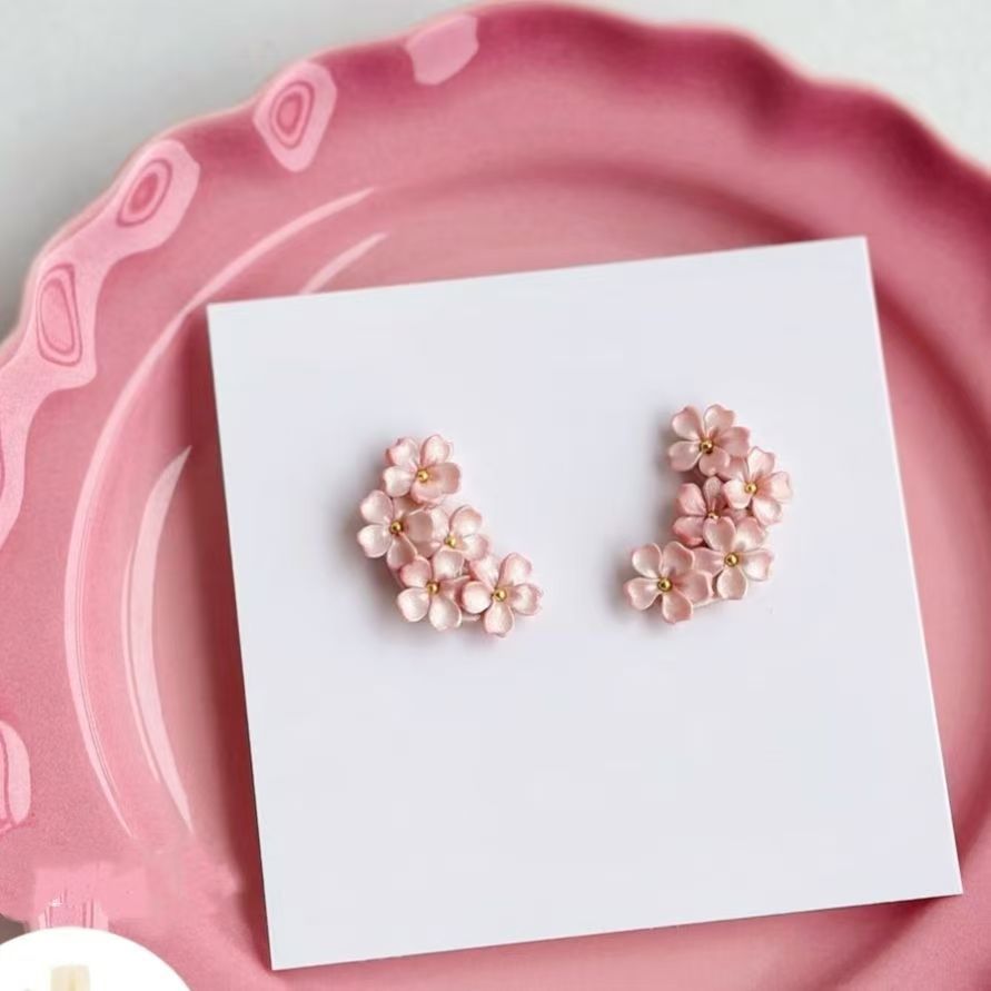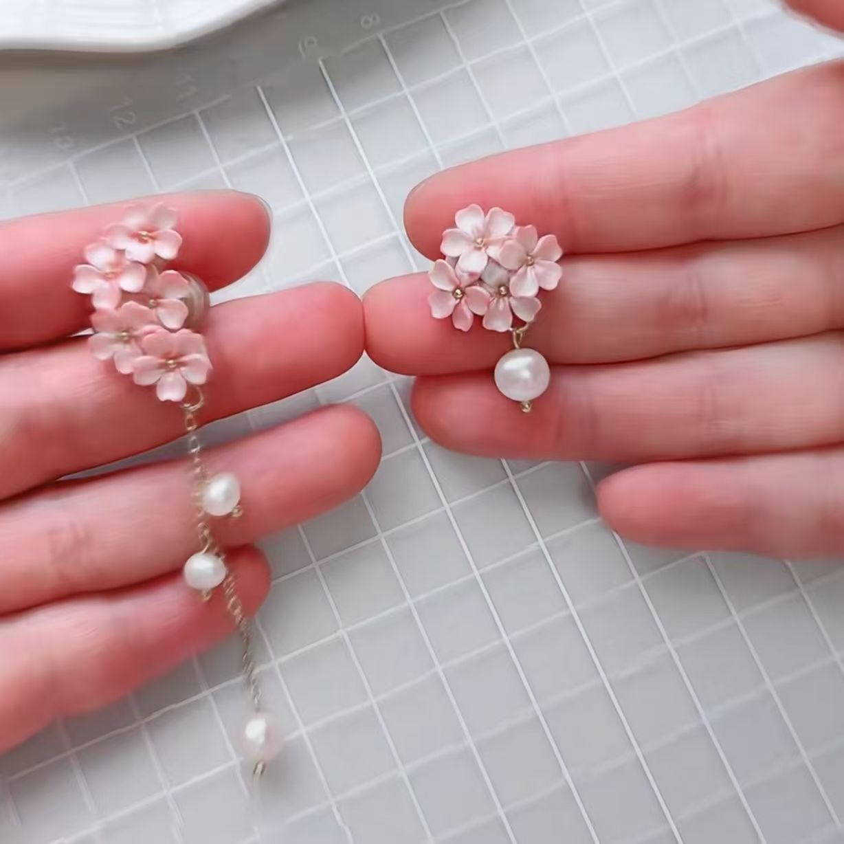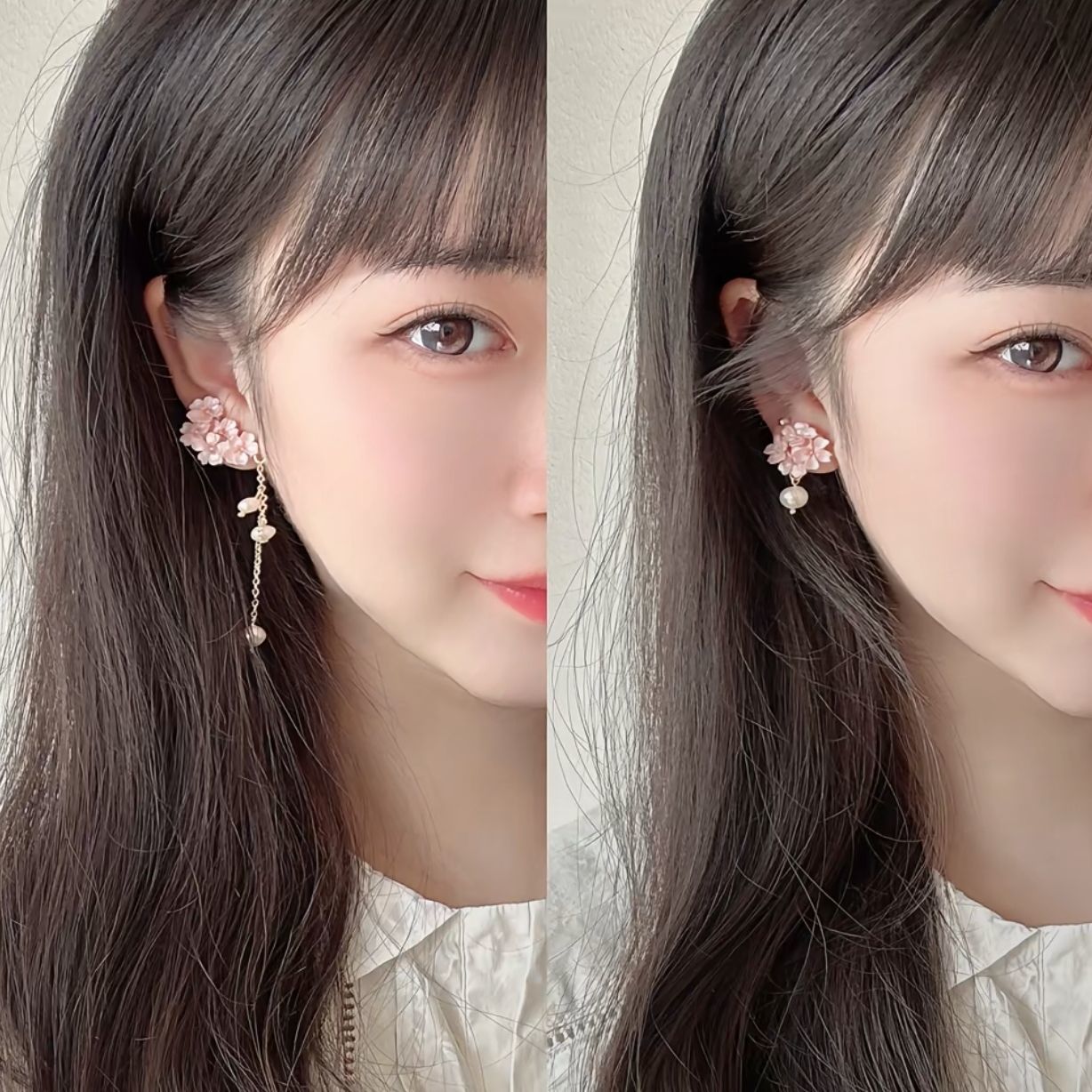 Color: MZ-00534 pink cherry blossom asymmetric ear studs, MZ-00534 pink cherry blossom short ear studs, MZ-00534 pink cherry blossom long fringe ear studs, MZ-00534 a bunch of pink cherry blossom ear studs, MZ-00534 pink cherry blossom asymmetric triangle ear clips, MZ-00534 cherry blossom short triangle ear clips, MZ-00534 pink sakura tassels long triangle ear clip, MZ-00534 a bunch of pink cherry blossom triangle ear clip