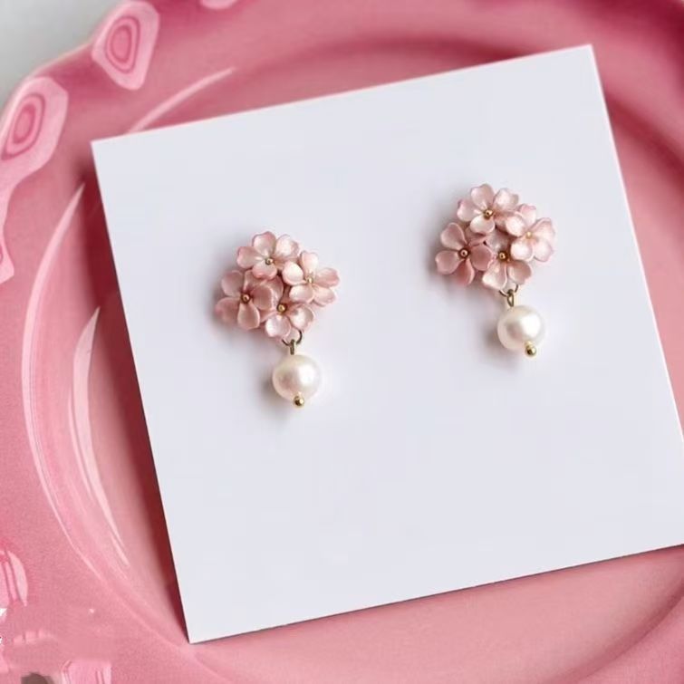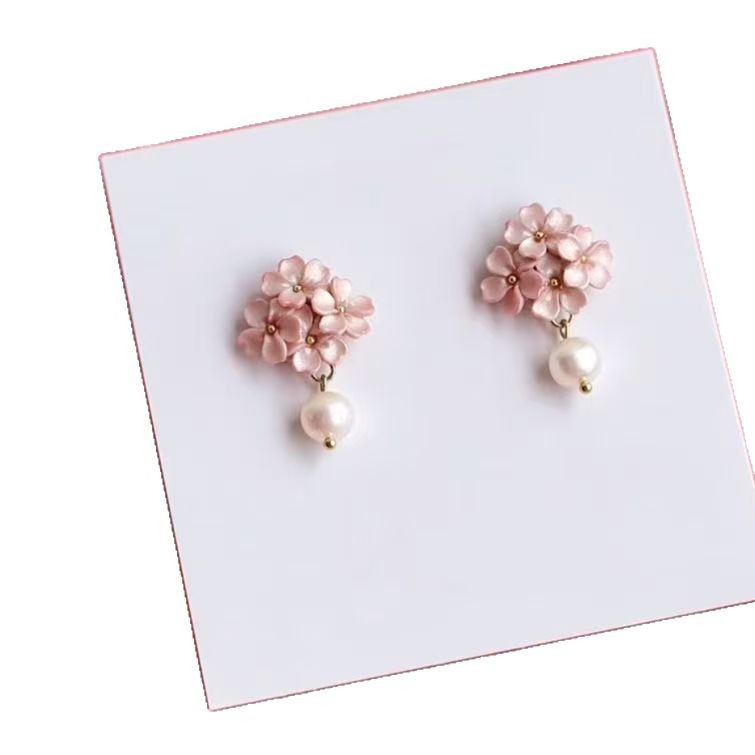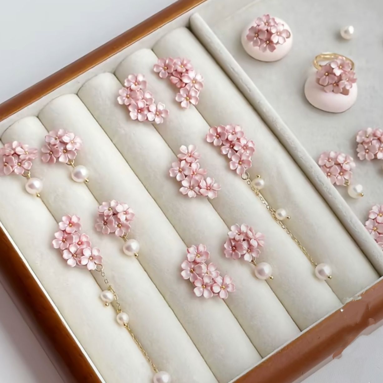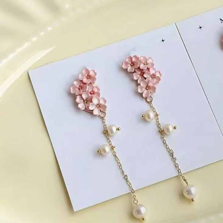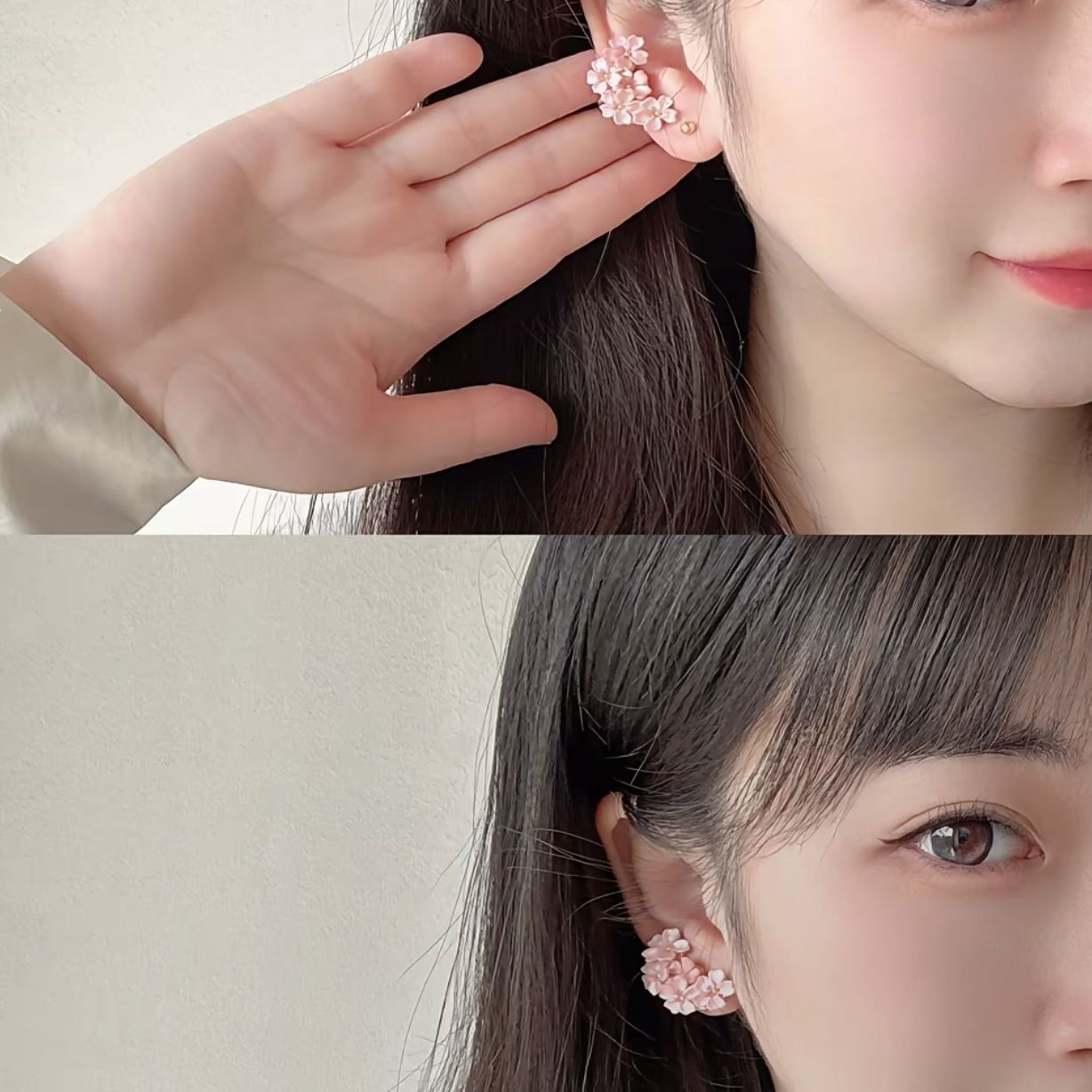 Color: MZ-00534 pink cherry blossom asymmetric ear studs, MZ-00534 pink cherry blossom short ear studs, MZ-00534 pink cherry blossom long fringe ear studs, MZ-00534 a bunch of pink cherry blossom ear studs, MZ-00534 pink cherry blossom asymmetric triangle ear clips, MZ-00534 cherry blossom short triangle ear clips, MZ-00534 pink sakura tassels long triangle ear clip, MZ-00534 a bunch of pink cherry blossom triangle ear clip