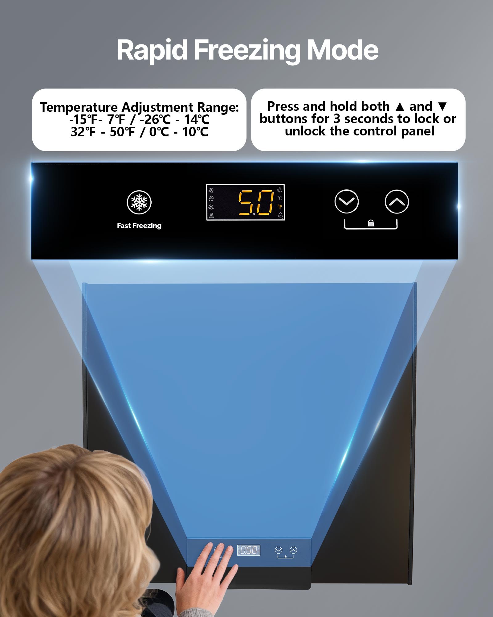 Precise Temperature Control: Featuring an electronic control panel with 1°F temperature display accuracy, this compact deep freezer supports -15°F to 7°F adjustment for freezing and 32°F to 50°F adjustment for refrigeration, precisely adjusting temperatures to suit different food storage needs