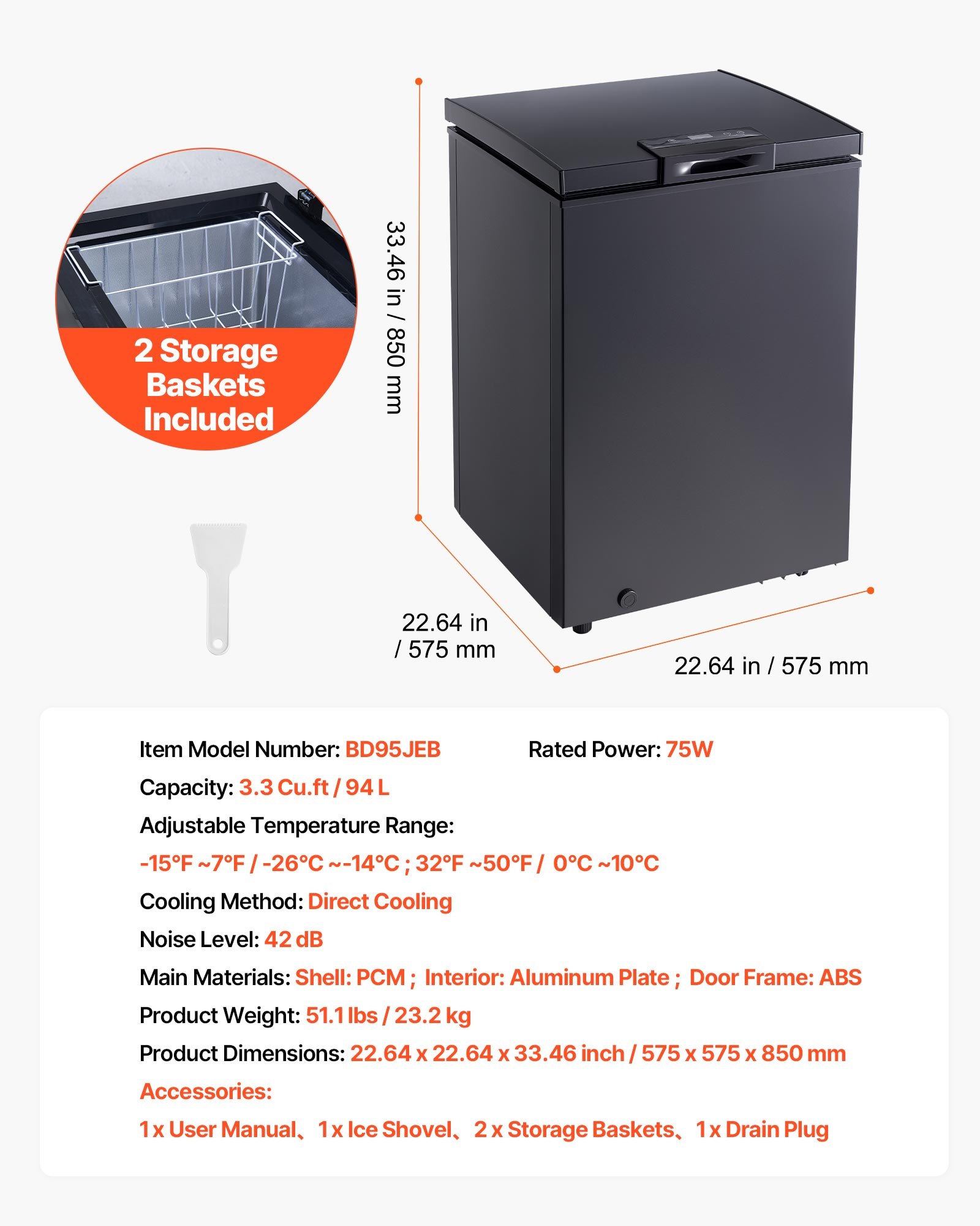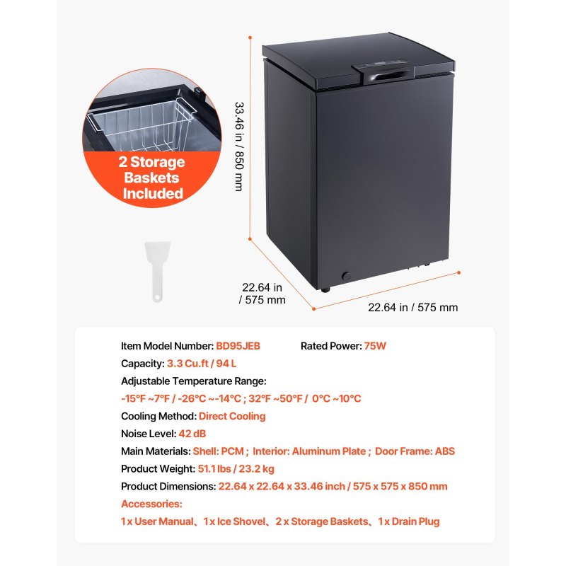 3.3 Cu.ft Capacity with 2 Baskets: VEVOR chest freezer features a 3.3 cu.ft / 94 L large capacity and 2 baskets for organized food storage and quick access, maintaining consistent freezing conditions to keep food fresher for longer. Also provide a shovel for convenient defrosting