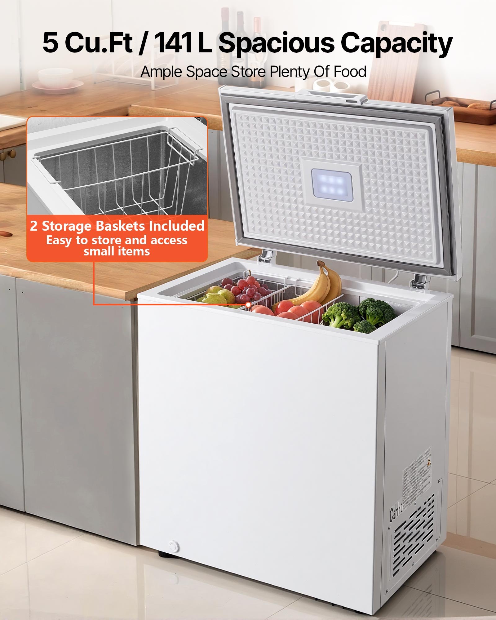 5 Cu.ft Capacity with 2 Baskets: VEVOR chest freezer features a 5 cu.ft / 141 L large capacity and 2 baskets for organized food storage and quick access, maintaining consistent freezing conditions to keep food fresher for longer. Also provide a shovel for convenient defrosting