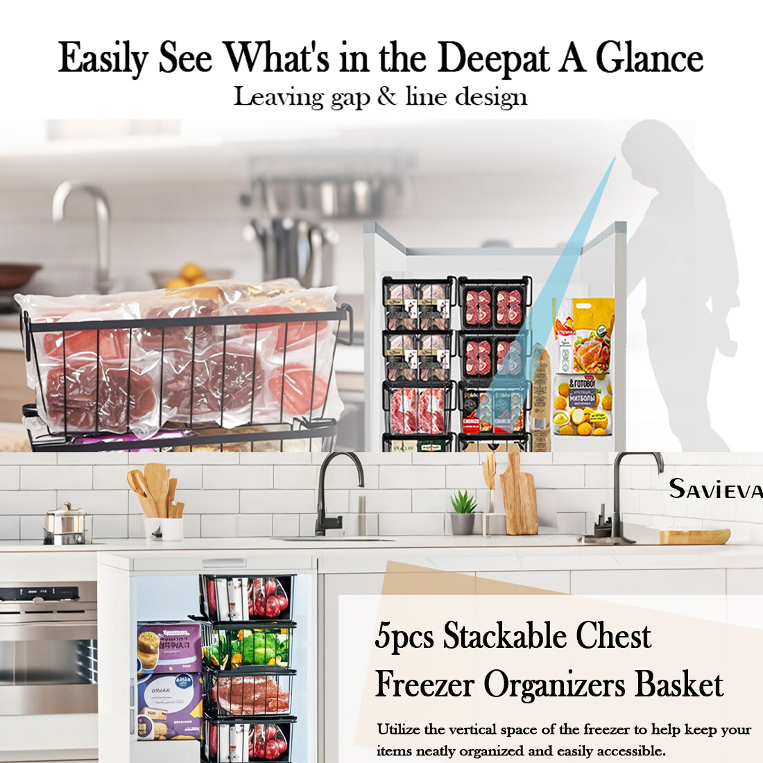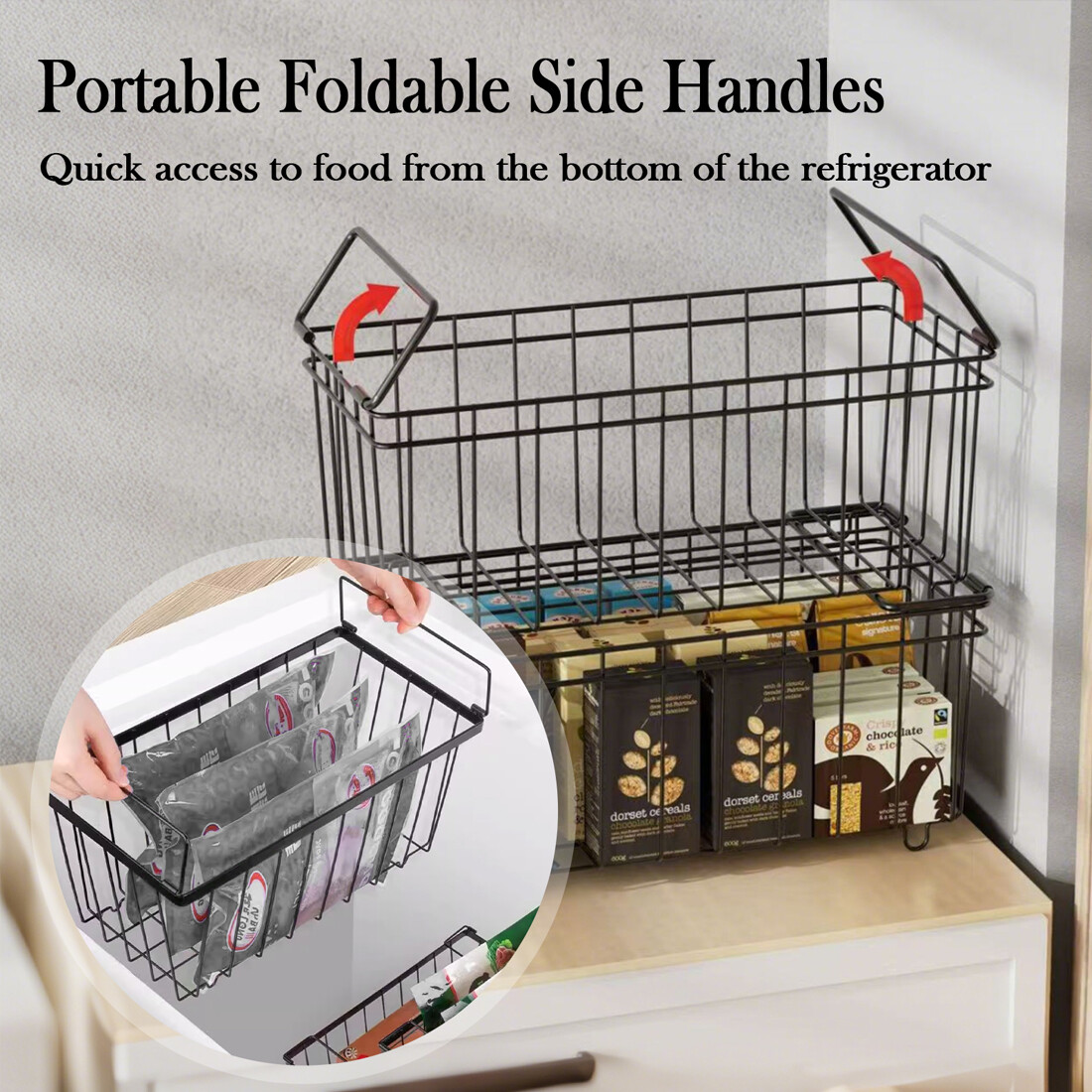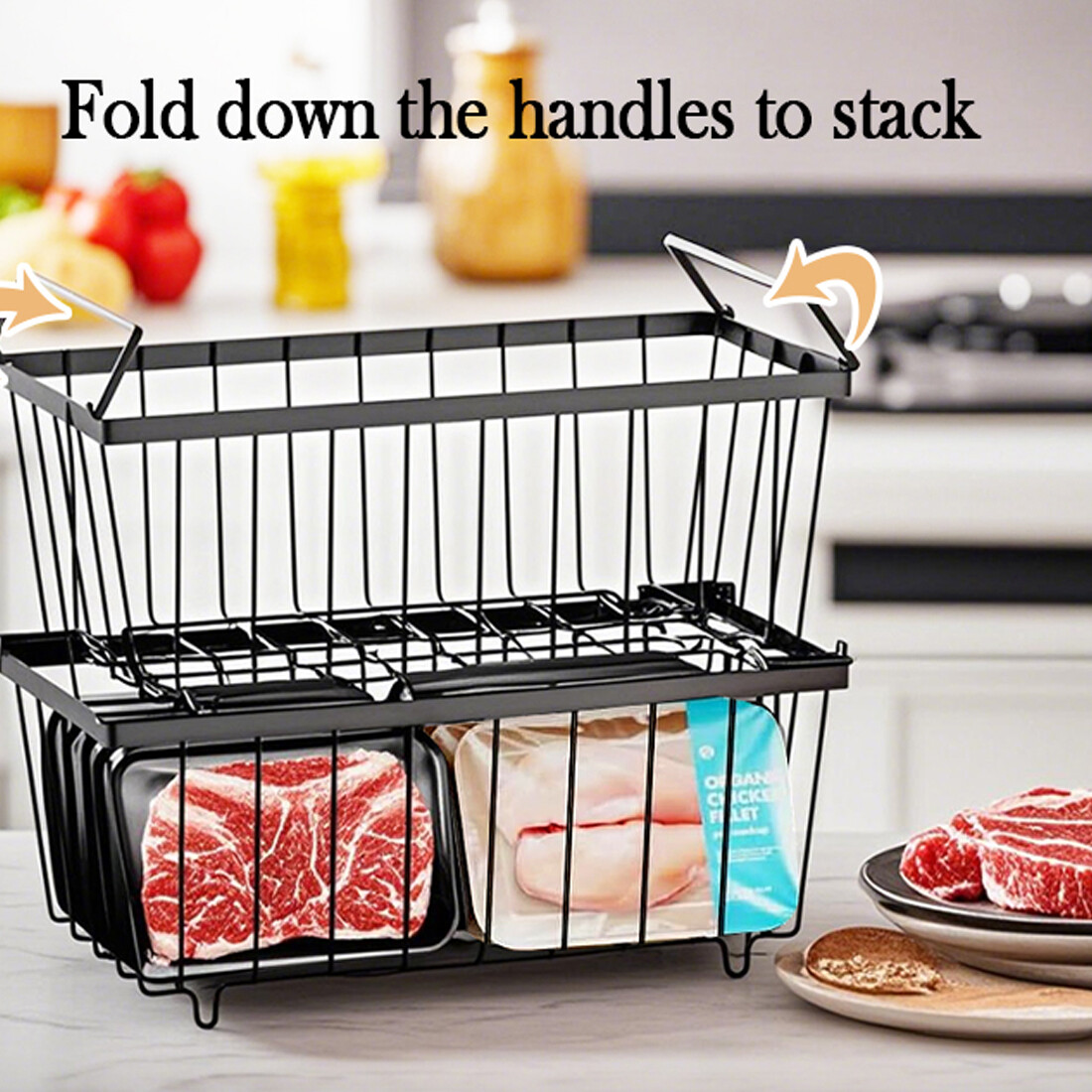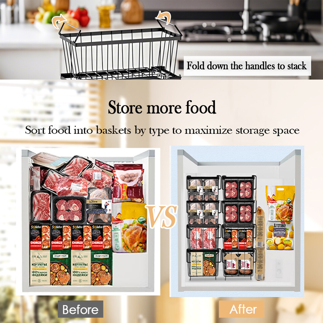 [Easy Get & Save Space] Freezer baskets are easy to lift and move, helping you quickly view the food without having to search all the items, easy to get the frozen food you want. When the handle is folded, baskets can be stacked, maximizing the vertical space of freezer to store more frozen food