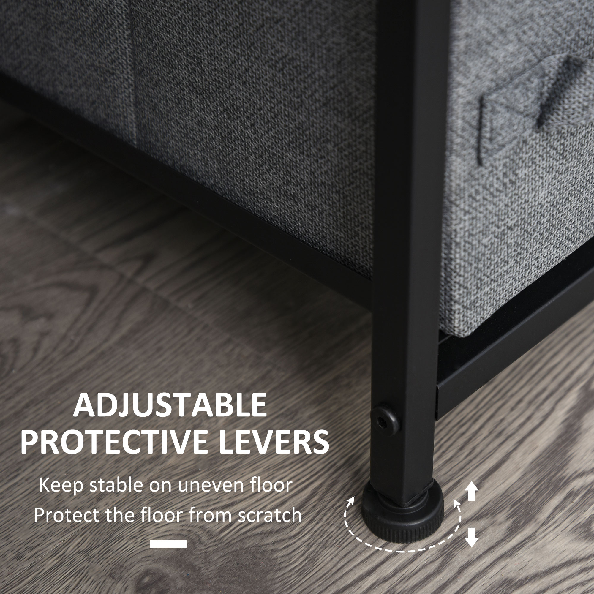 The bedroom chest of drawers is the great solution for keeping your bedroom organised. Built with a stable steel frame and engineered wood top, it provides reliable display space. With four small drawers and three large ones, it offers generous storage for clothes and other essentials. The adjustable feet ensure stability, making it suitable as a bedroom dresser, bedroom unit, or stylish fabric drawer for any modern space.