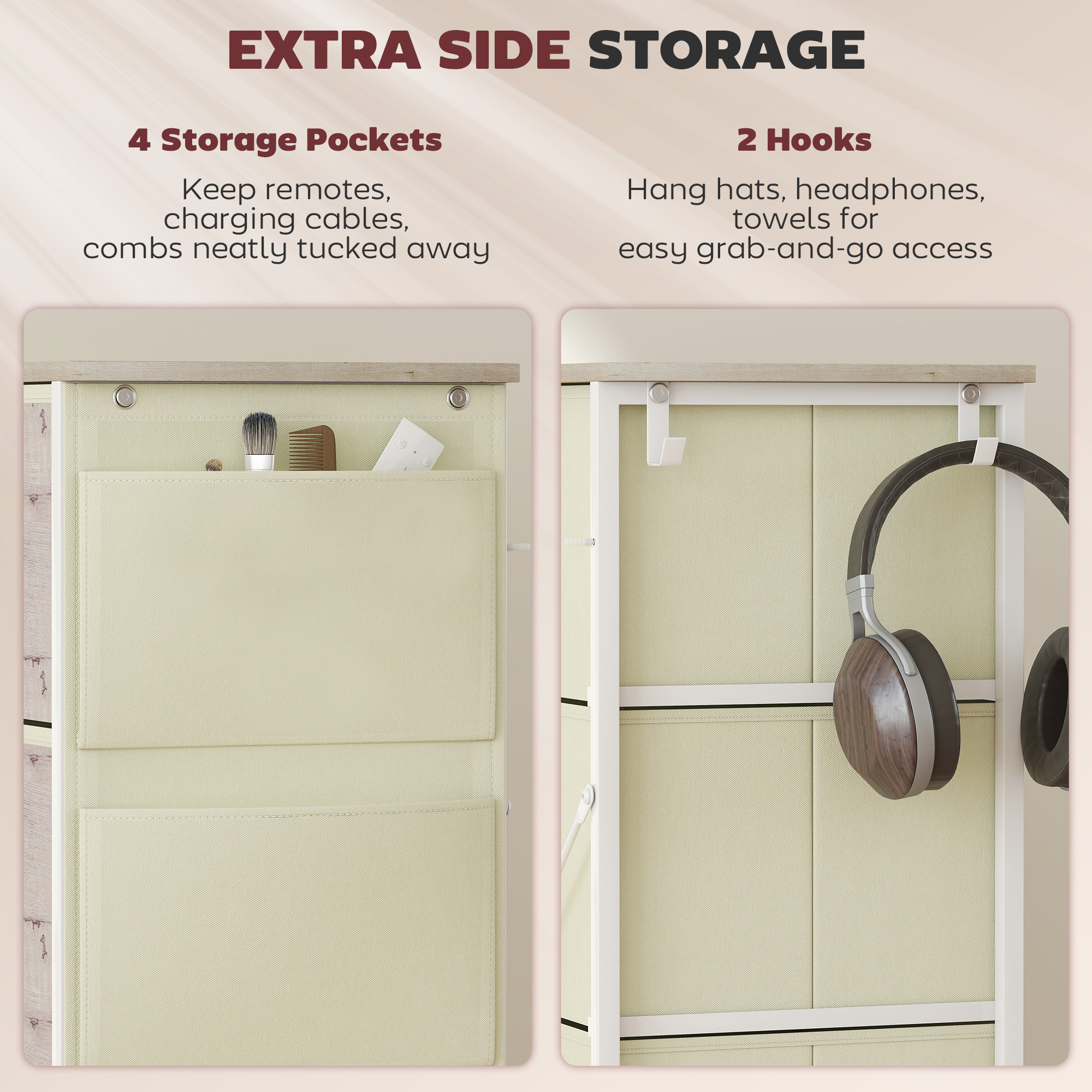 Easy, simple storage with this fabric chest of drawers. With eight same drawers, it's easy to sort everything from socks to pants. It also features four side pockets and two hooks to get smaller accessories altogether. A steel frame with X-bars keeps this bedroom dresser stable, finished with adjustable feet for balance - even on unsteady grounds.
