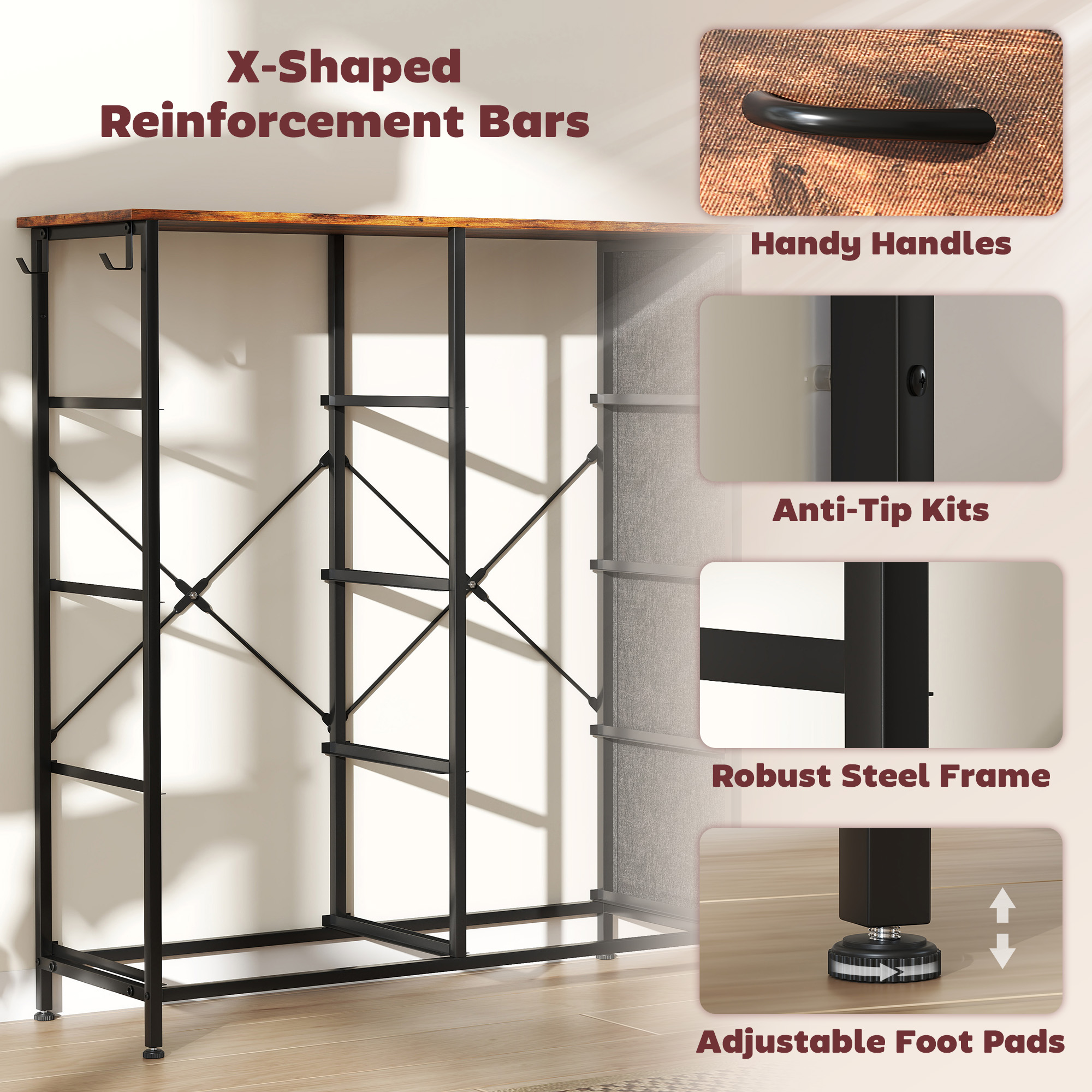 Easy, simple storage with this fabric chest of drawers. With eight same drawers, it's easy to sort everything from socks to pants. It also features four side pockets and two hooks to get smaller accessories altogether. A steel frame with X-bars keeps this bedroom dresser stable, finished with adjustable feet for balance - even on unsteady grounds.